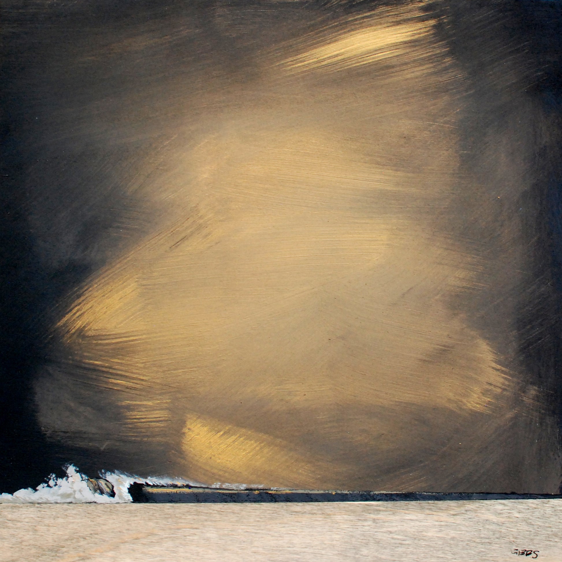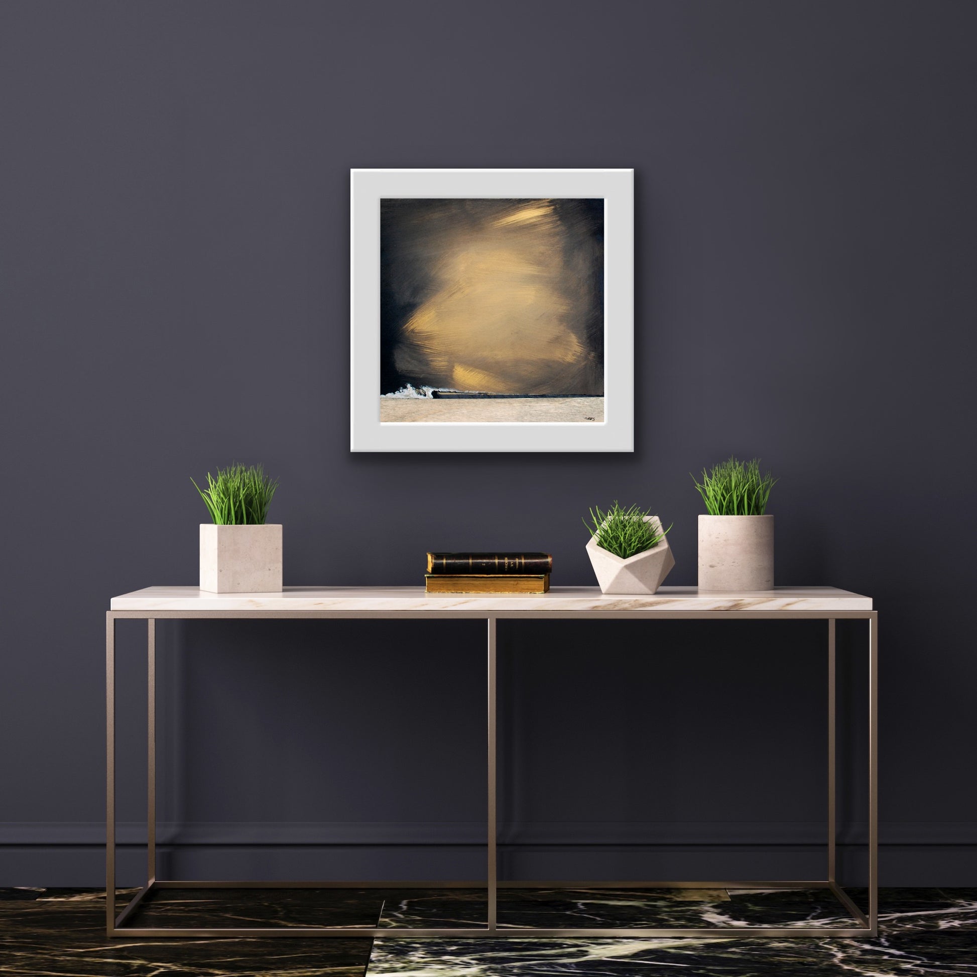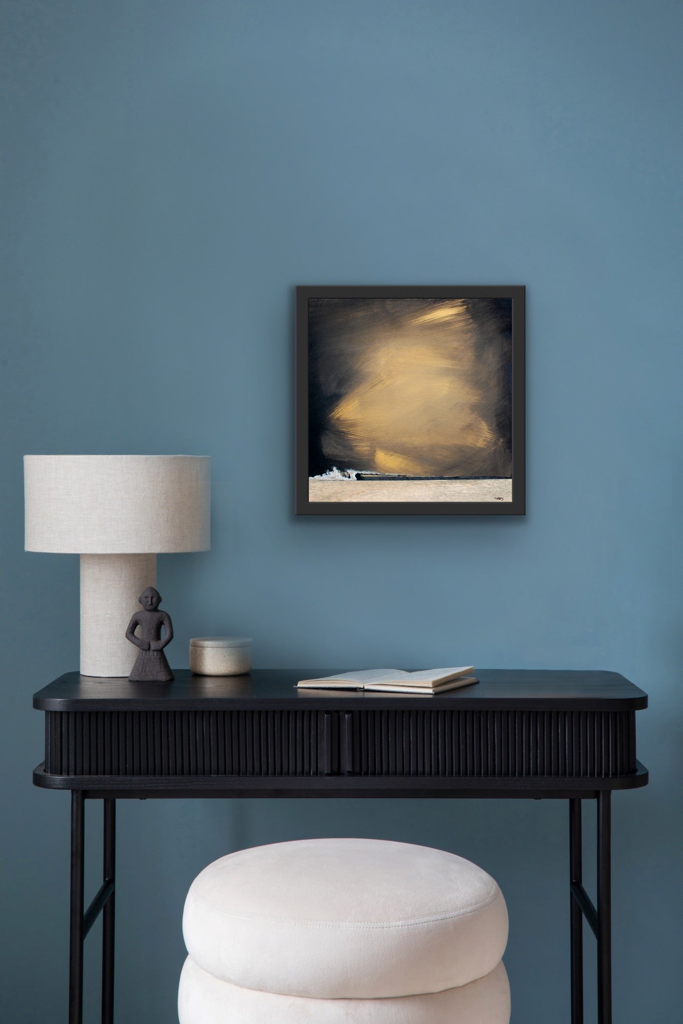 A glowing brush of golden light sweeps through a moody charcoal sky in A Long Walk #7, a bold example of modern surf art that blends atmospheric depth with coastal simplicity. A single breaking wave hugs the lower edge of the composition, rendered with raw texture and restraint. The natural wood grain below mirrors sand, grounding the viewer in a serene, almost sacred shoreline moment.