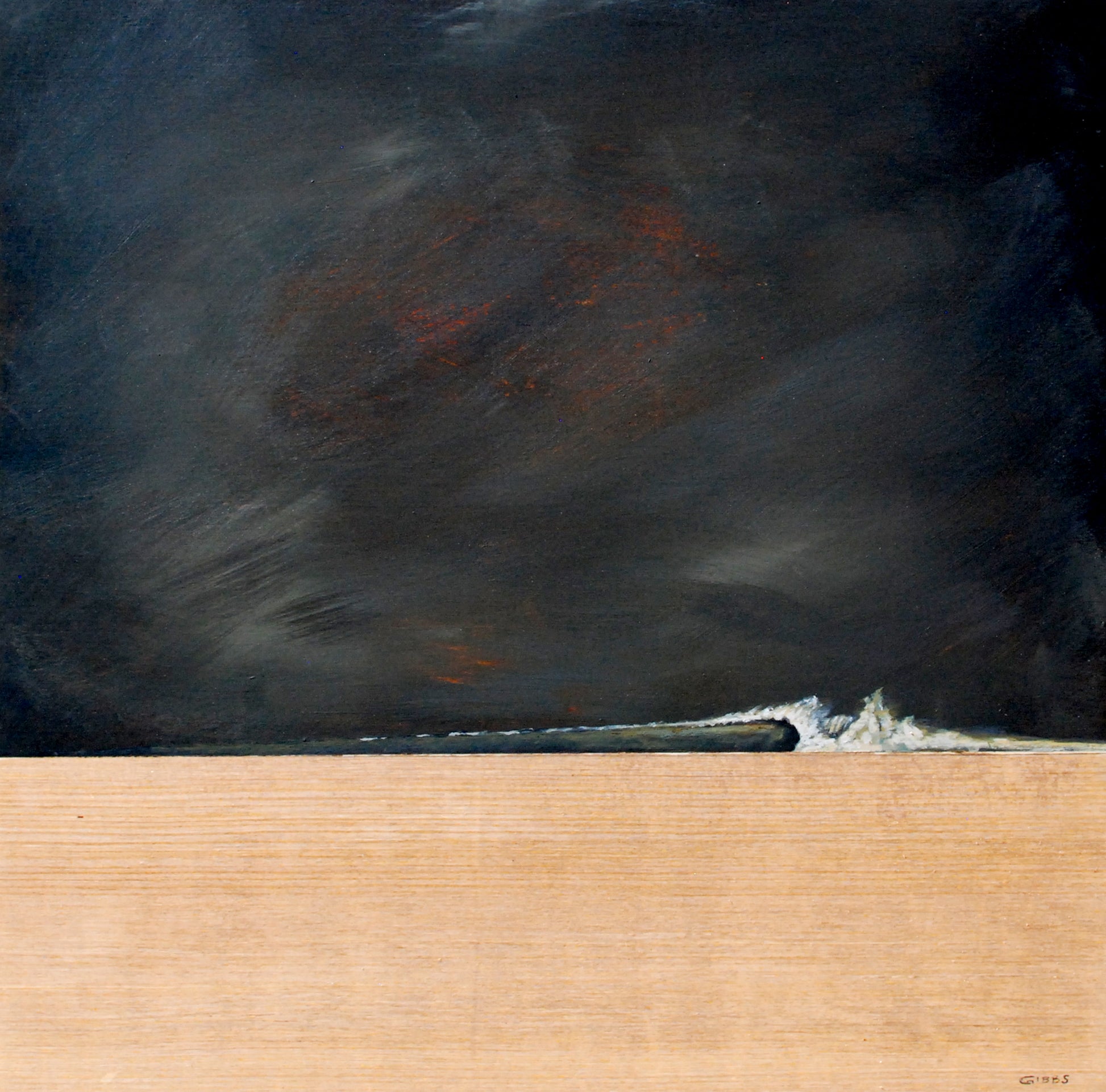 Evening Pulse is a striking example of modern surf art where restraint meets raw energy. With a wave breaking in the distance against a backdrop of storm-dark clouds, the composition draws the viewer into a brooding seascape. Faint ember-red highlights glow within the sky, hinting at a fading sun, while the wood grain foreground anchors the painting with natural warmth.