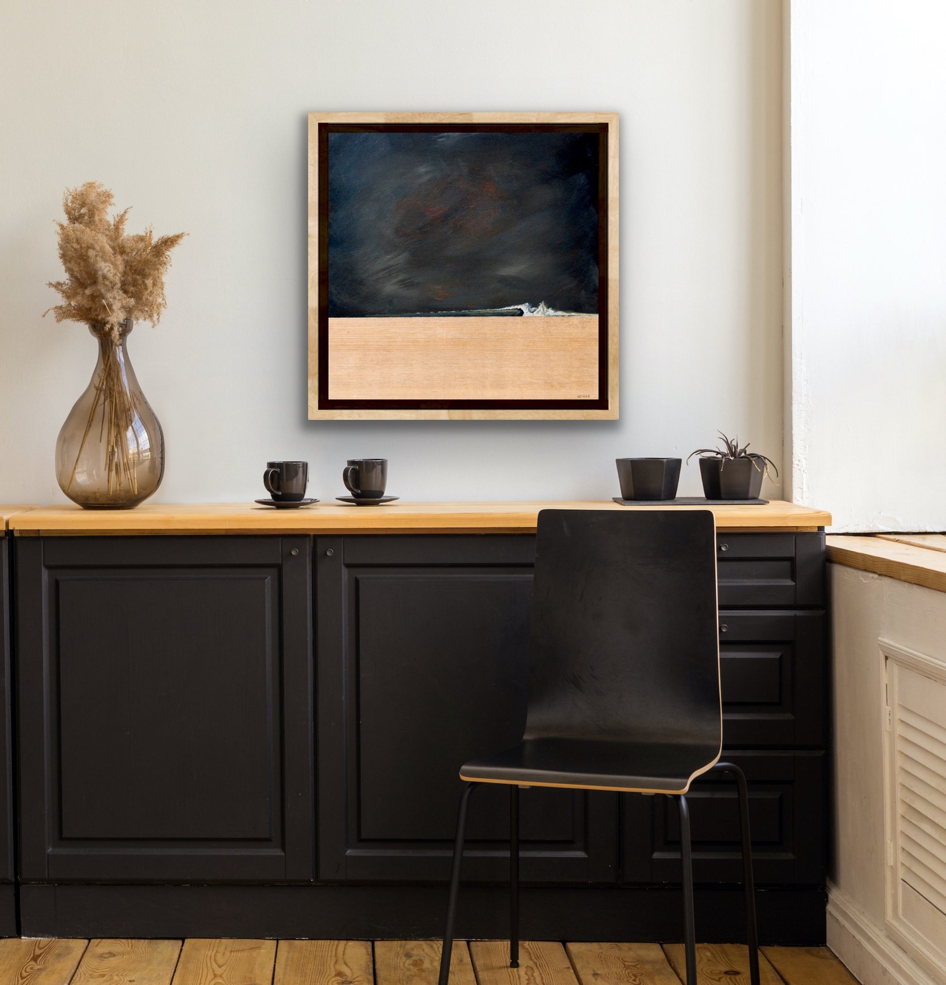 This piece bridges coastal art and abstract surf art, perfect for collectors of wave paintings, beach art, or ocean decor who appreciate a more minimalist aesthetic. The use of wood as a visual shoreline adds texture and contrast, giving it strong appeal as coastal wall decor or nautical wall art.