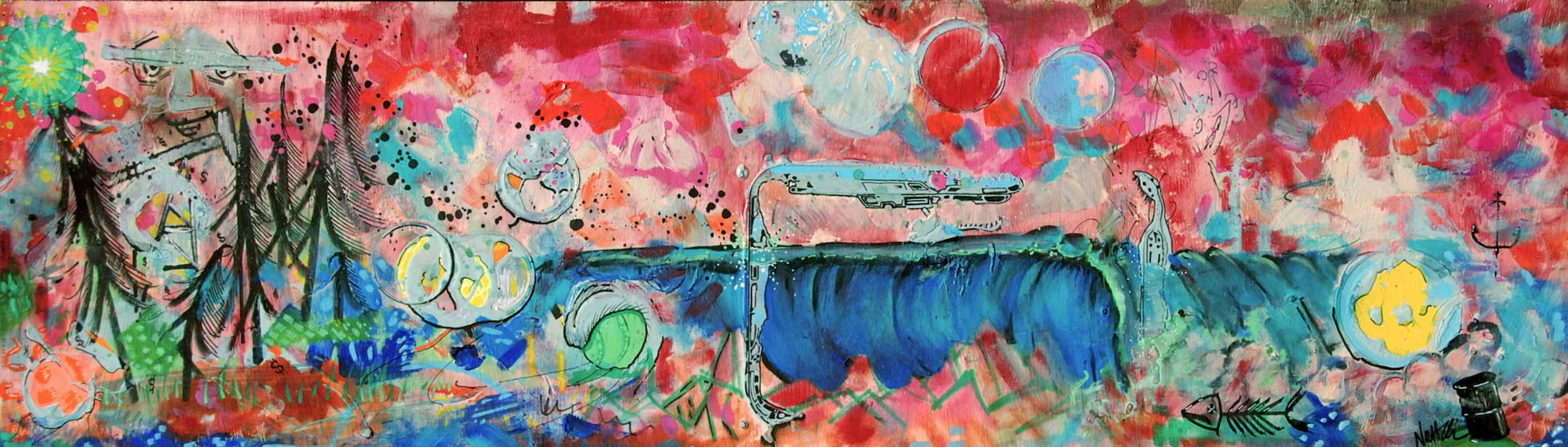 BP Oil Spill by Nathan Gibbs is a surreal ocean panorama bursting with psychedelic color. Cartoonish bubbles, sea creatures, and a peeling wave swirl across a vivid coral-pink sky. The blackended trees and the BP oil logo, along with other small references tell of the chaotic aftermath of the BP Oil Spill in the gulf. Blending street art, surf culture, and environmental symbolism, this coastal dreamscape is ideal for collectors of bold, modern beach-inspired abstract art.