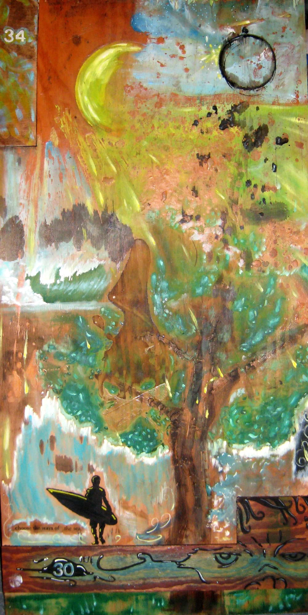 Workbench monologues is a series of abstract surreal surf art and landscape paintings that often focus on a theme. That theme could be environmental, personal growth, or any other similar topics. I will hide images within the work such as eyes, animals, or subject matter related to the overall theme. They are very organic and texture heavy. Zoom in and take a closer look at paintings within the paintings and see what there is beyond the obvious.