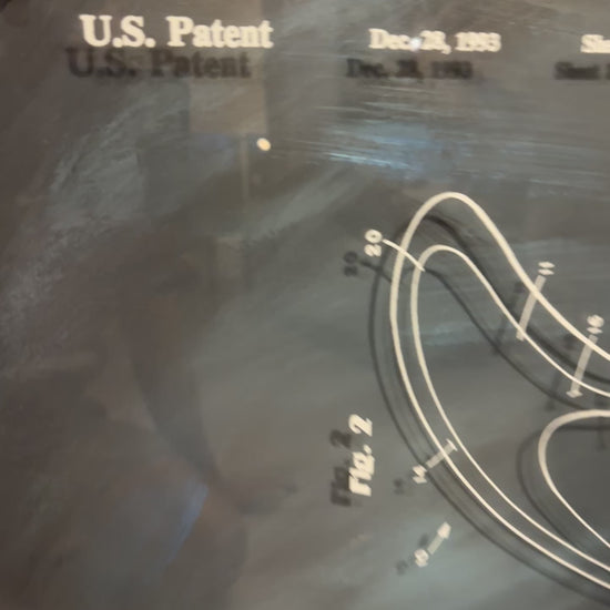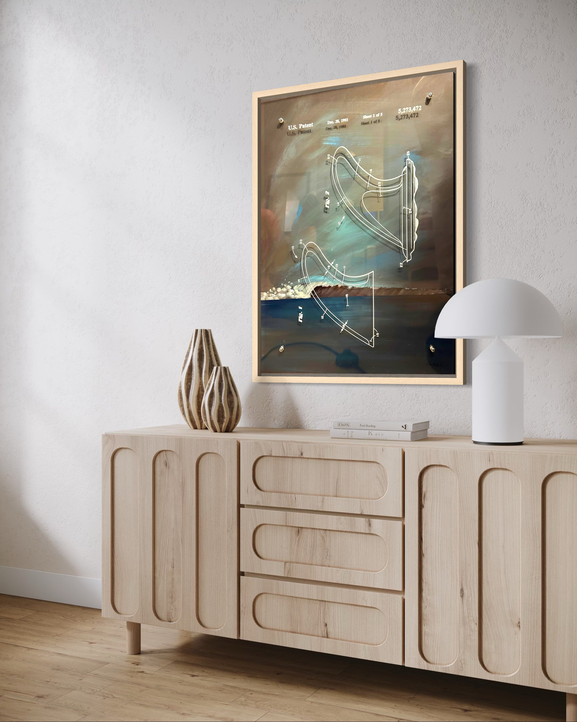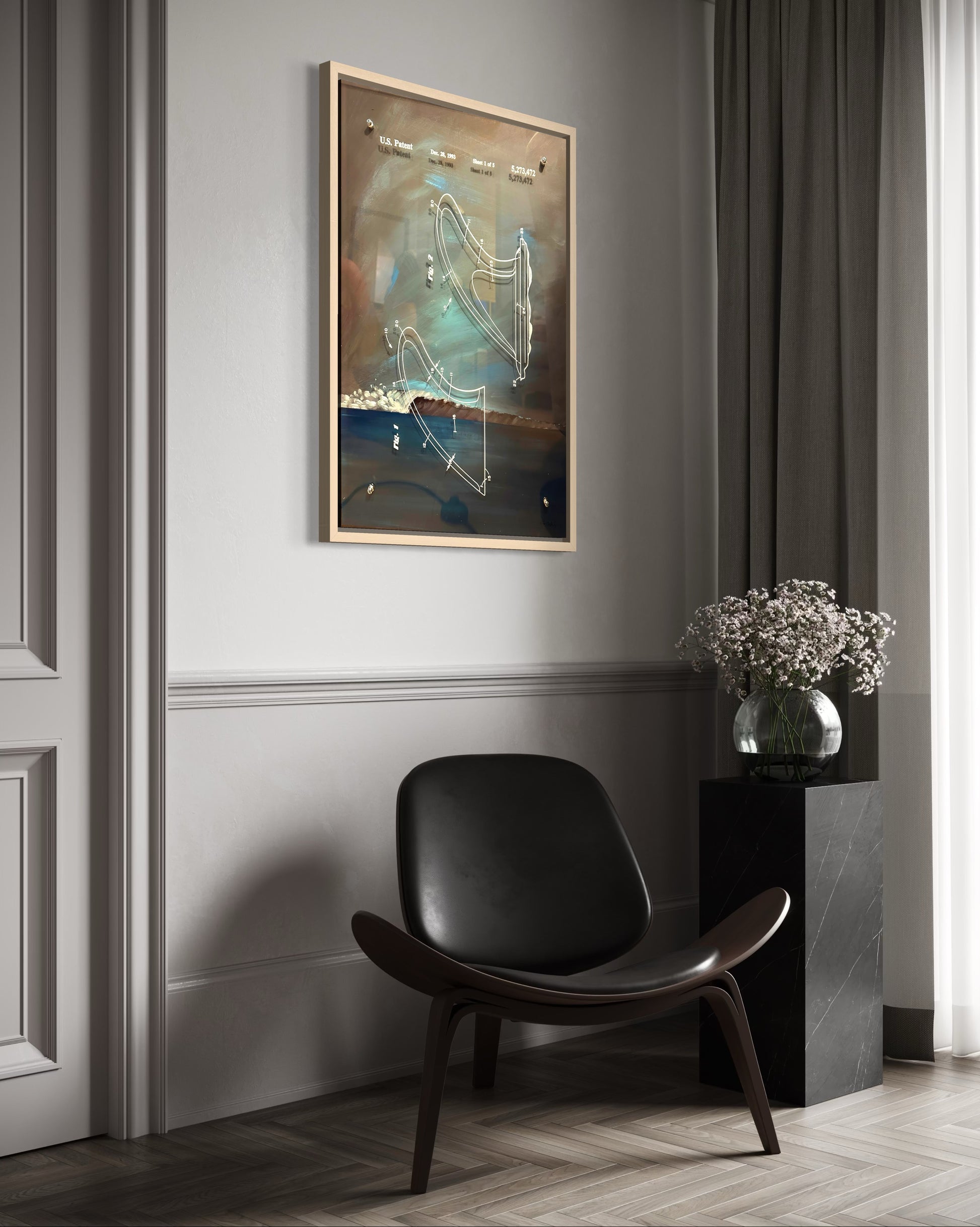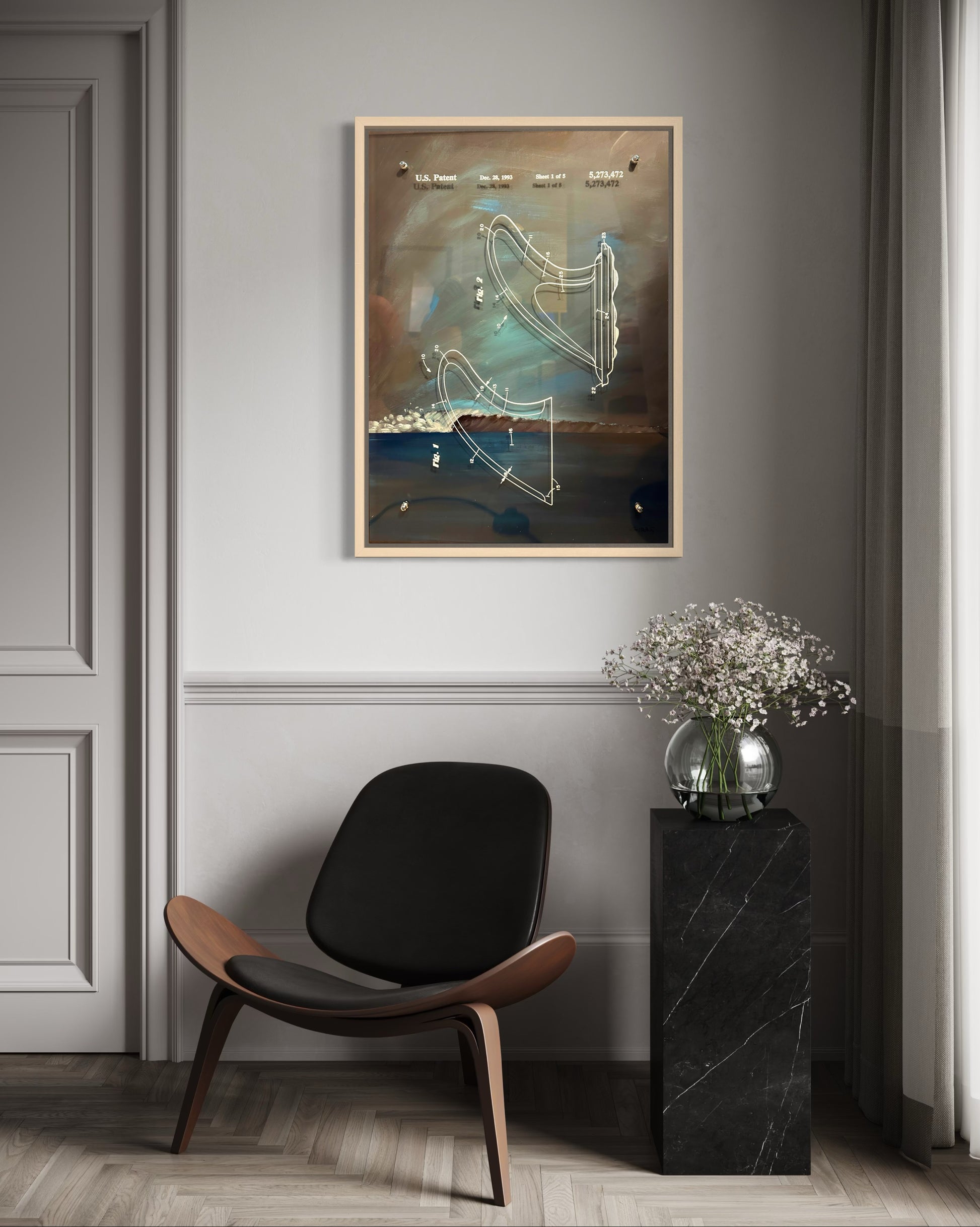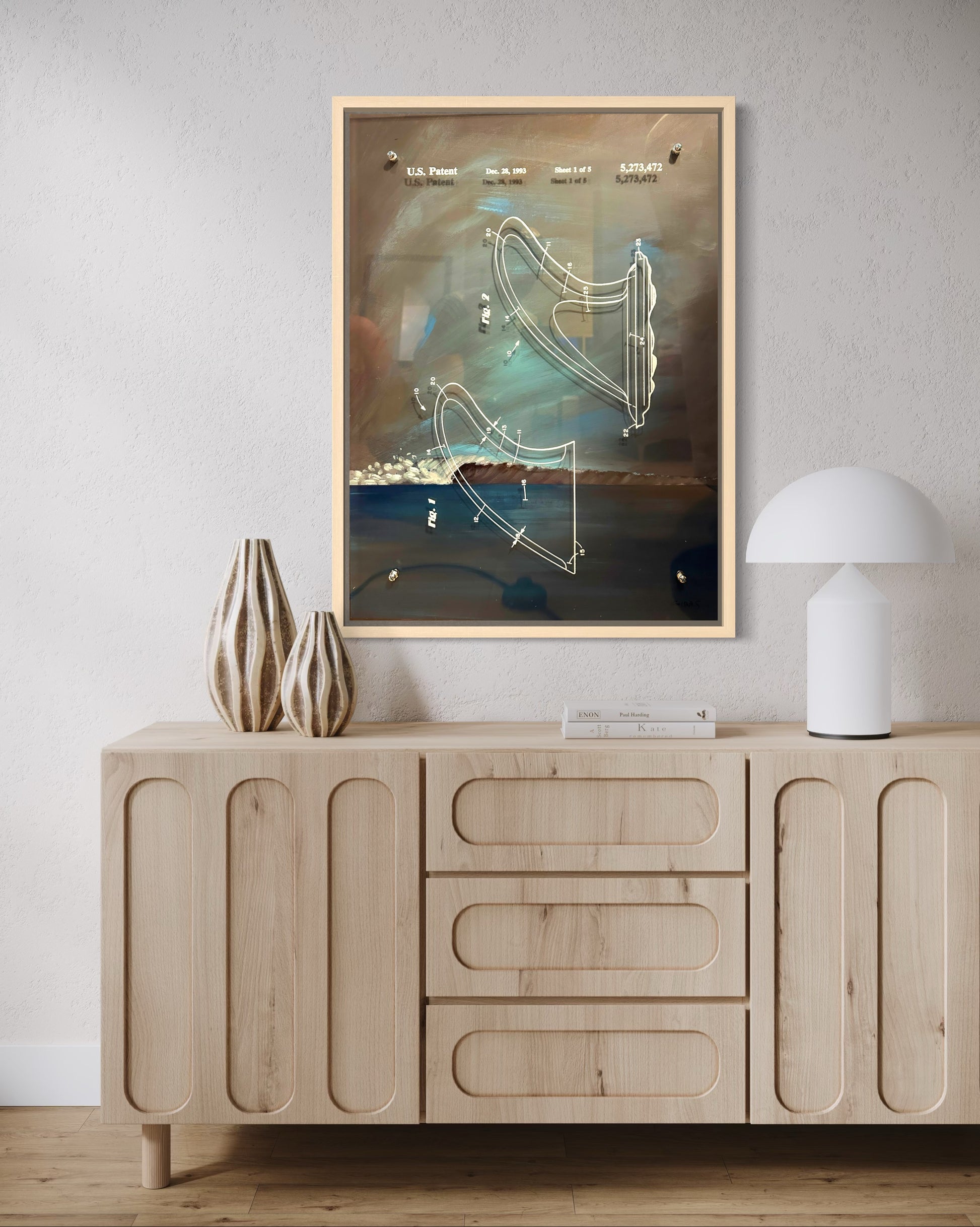 This piece is pure West Coast intellectual seduction. You’re looking at a hand-painted reinterpretation of U.S. Patent 5,273,472—a functional surf-fin design—reimagined as a moody, cinematic seascape. The artist didn’t just place a patent diagram on canvas; he elevated a piece of surf engineering into a kind of spiritual blueprint… the skeleton of motion, suspended over a storm-washed Pacific horizon.