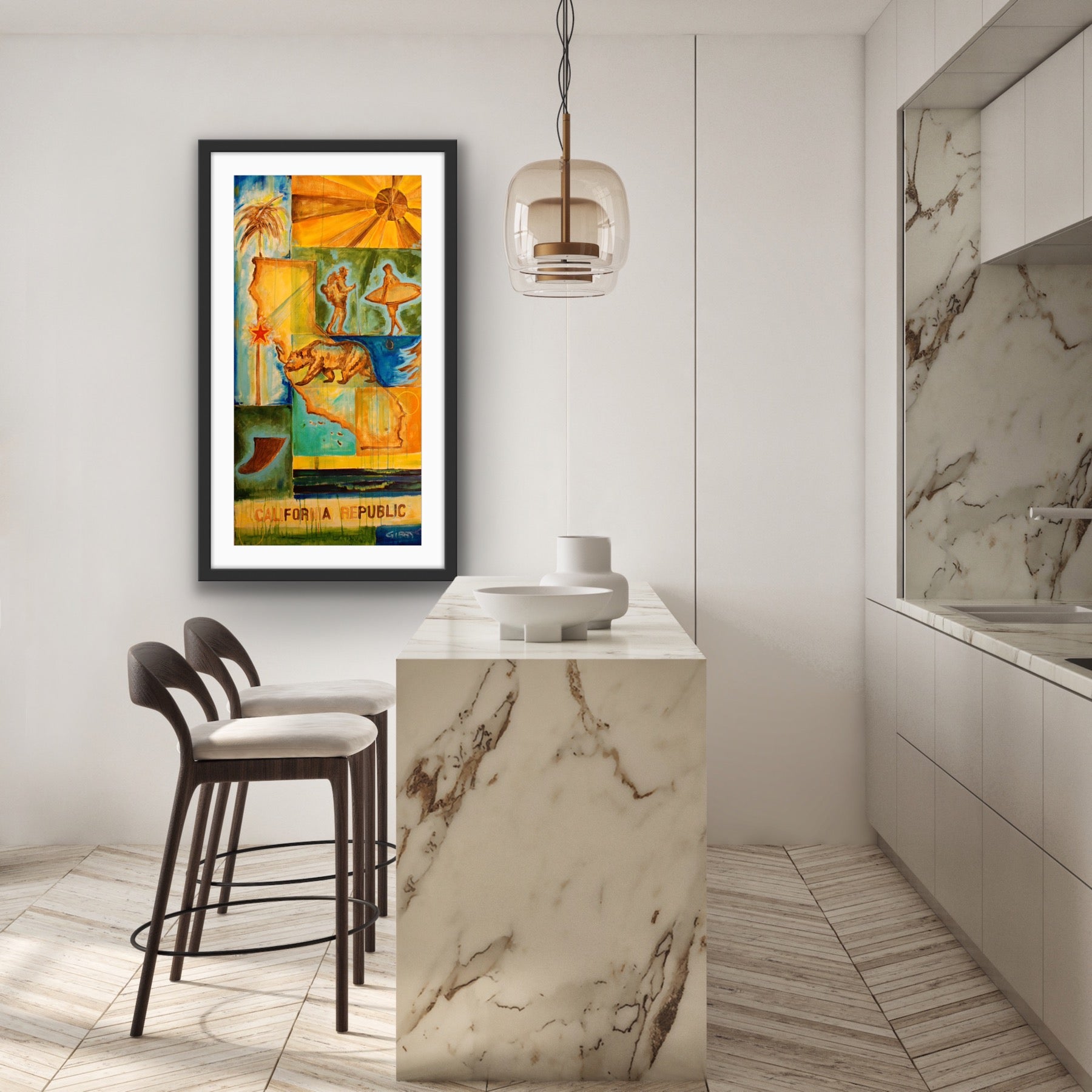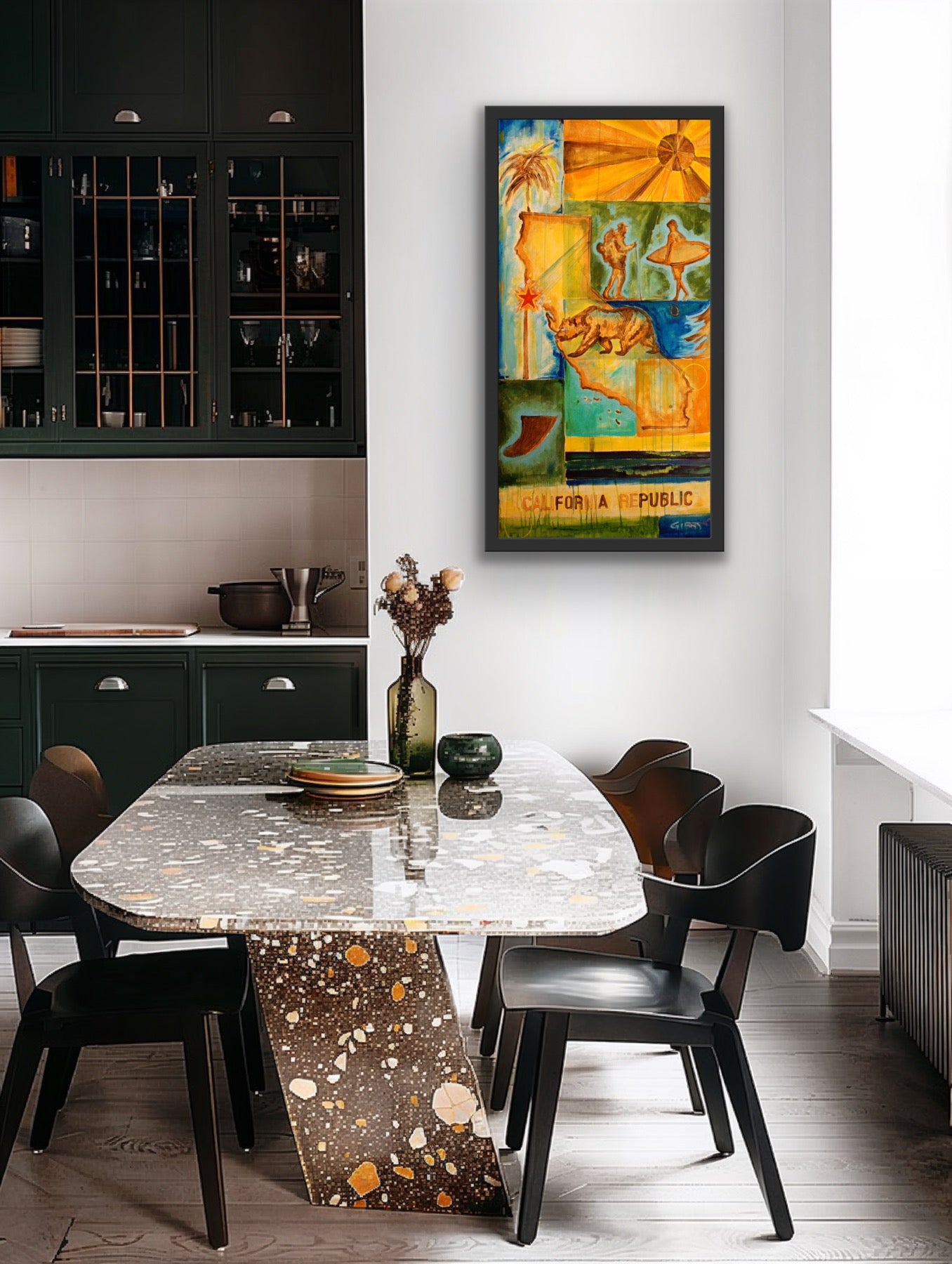 Ideal for collectors of California art, surf-inspired wall decor, or fans of mixed media Americana, this vibrant composition reflects everything from the Sierra hikes to Pacific swells.