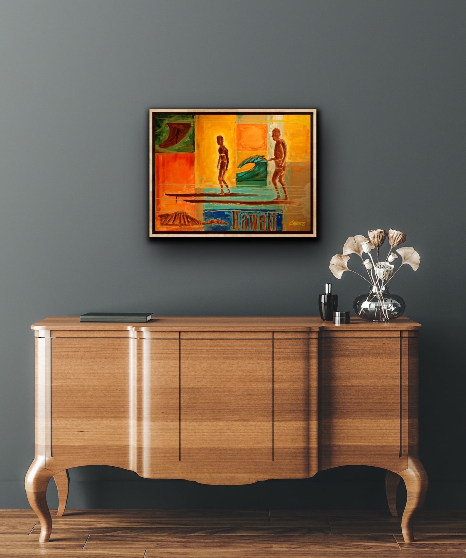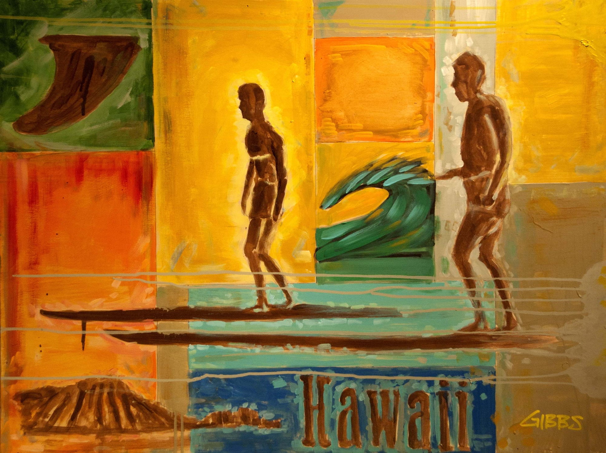 Destination Longboard captures the timeless rhythm of island life through the vibrant lens of artist Nathan Gibbs. This bold and expressive painting features two longboard surfers gliding across a tropical palette of golden oranges, ocean blues, and sun-kissed yellows. With symbolic elements like the Diamond Head crater, a stylized wave, and the word “Hawaii” grounded beneath the composition, the piece radiates the warmth and soul of the Aloha State.