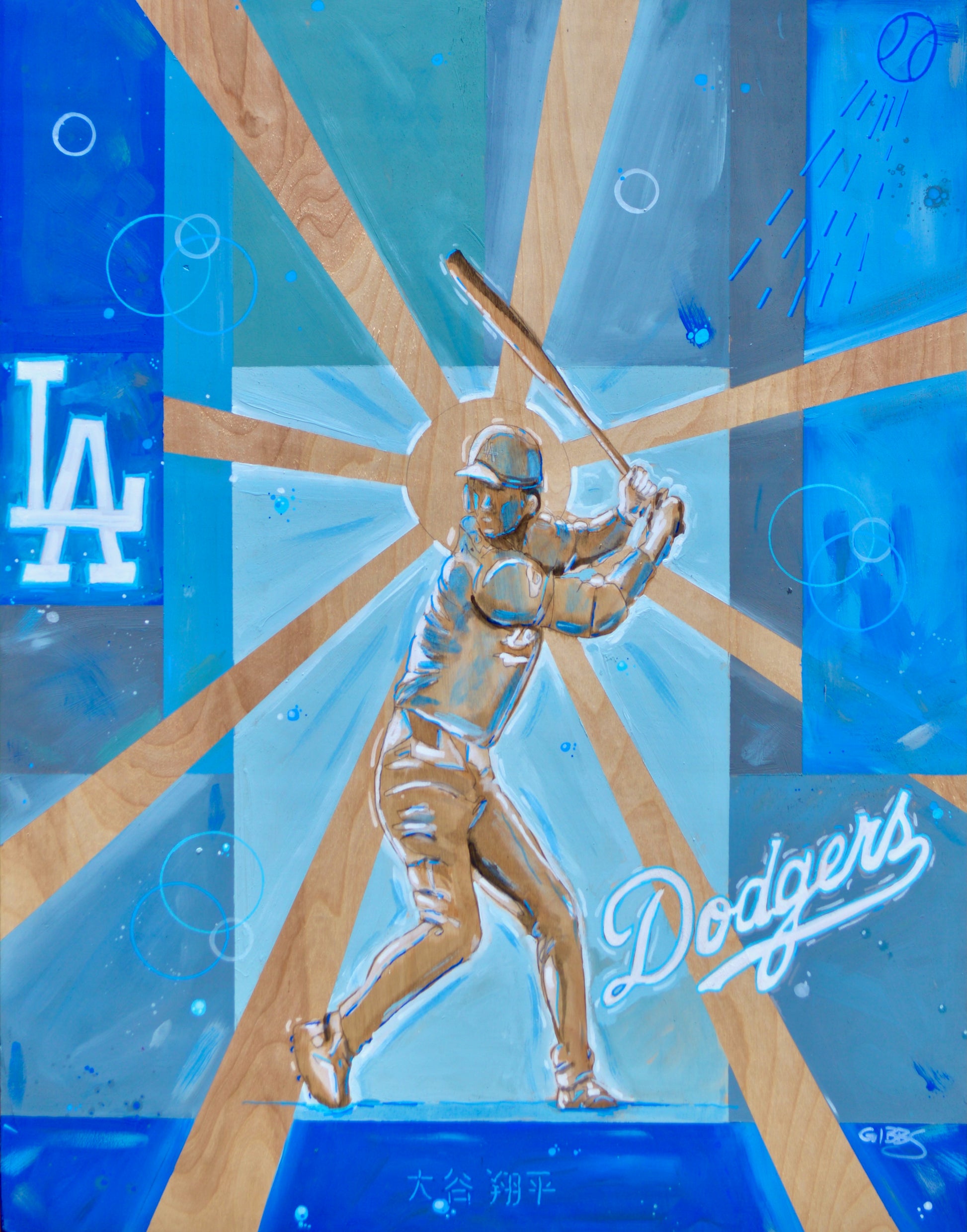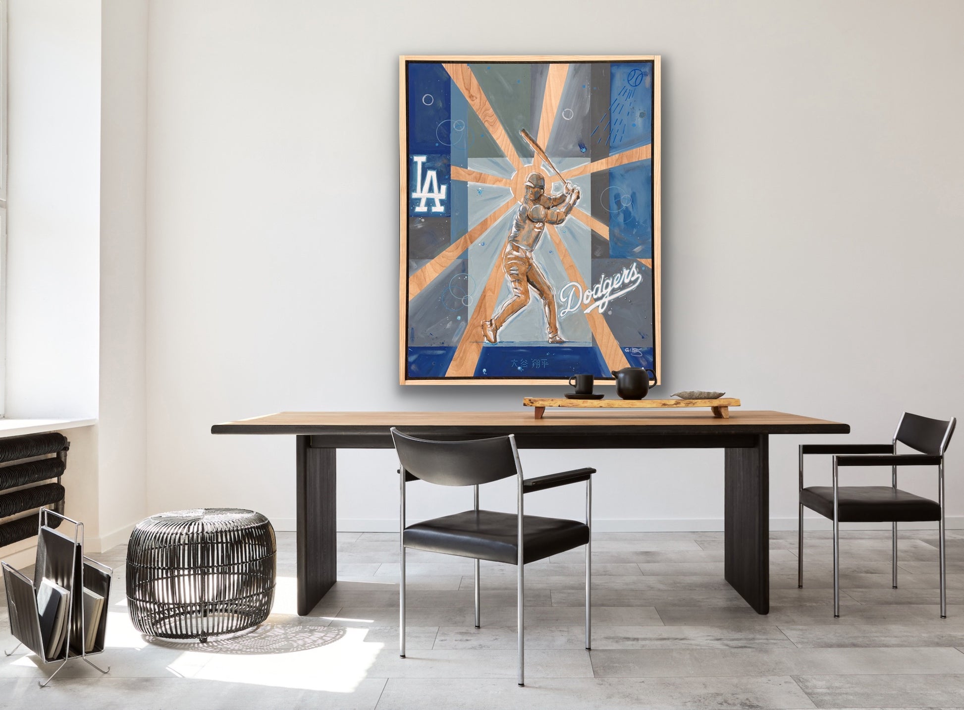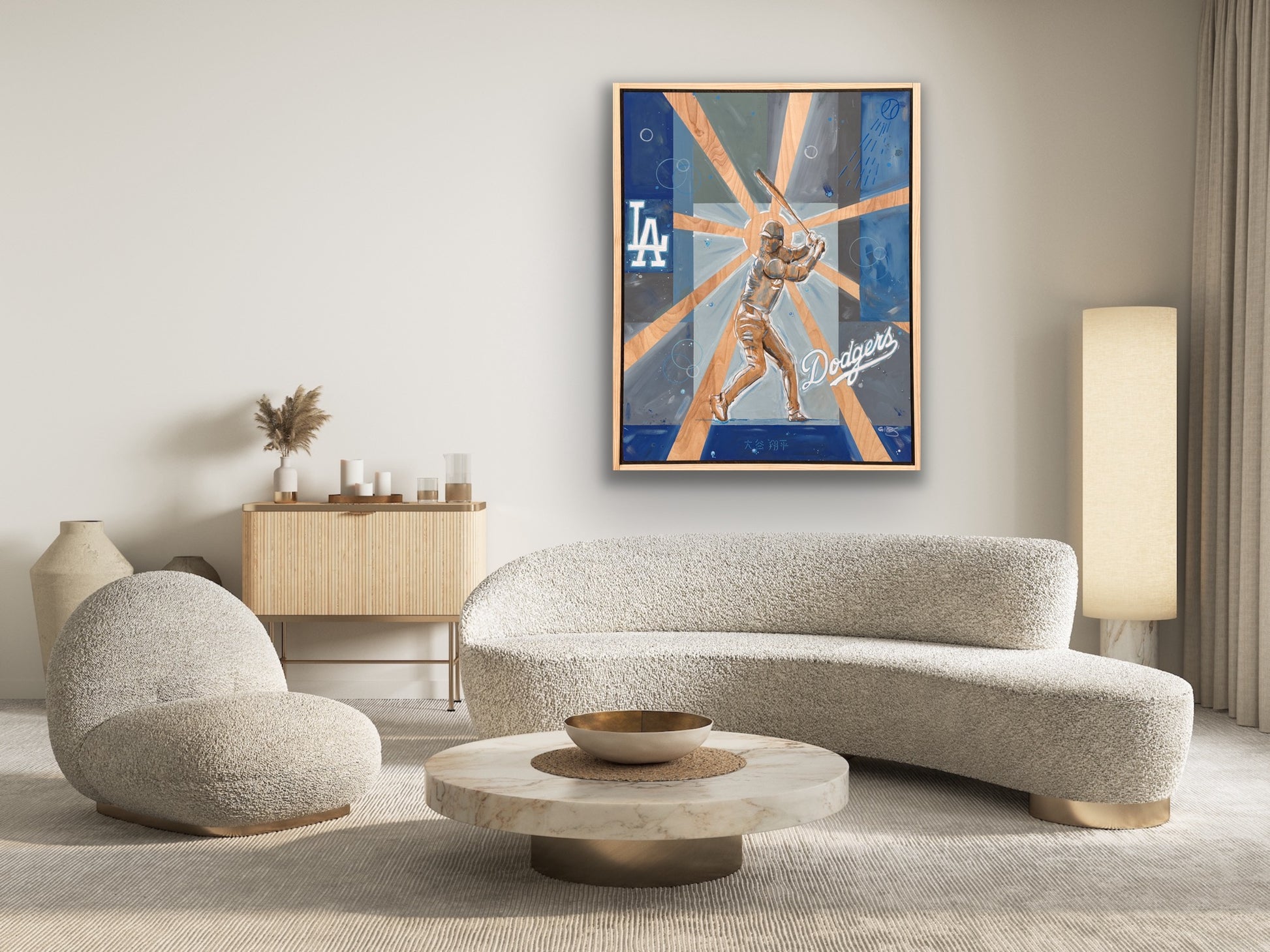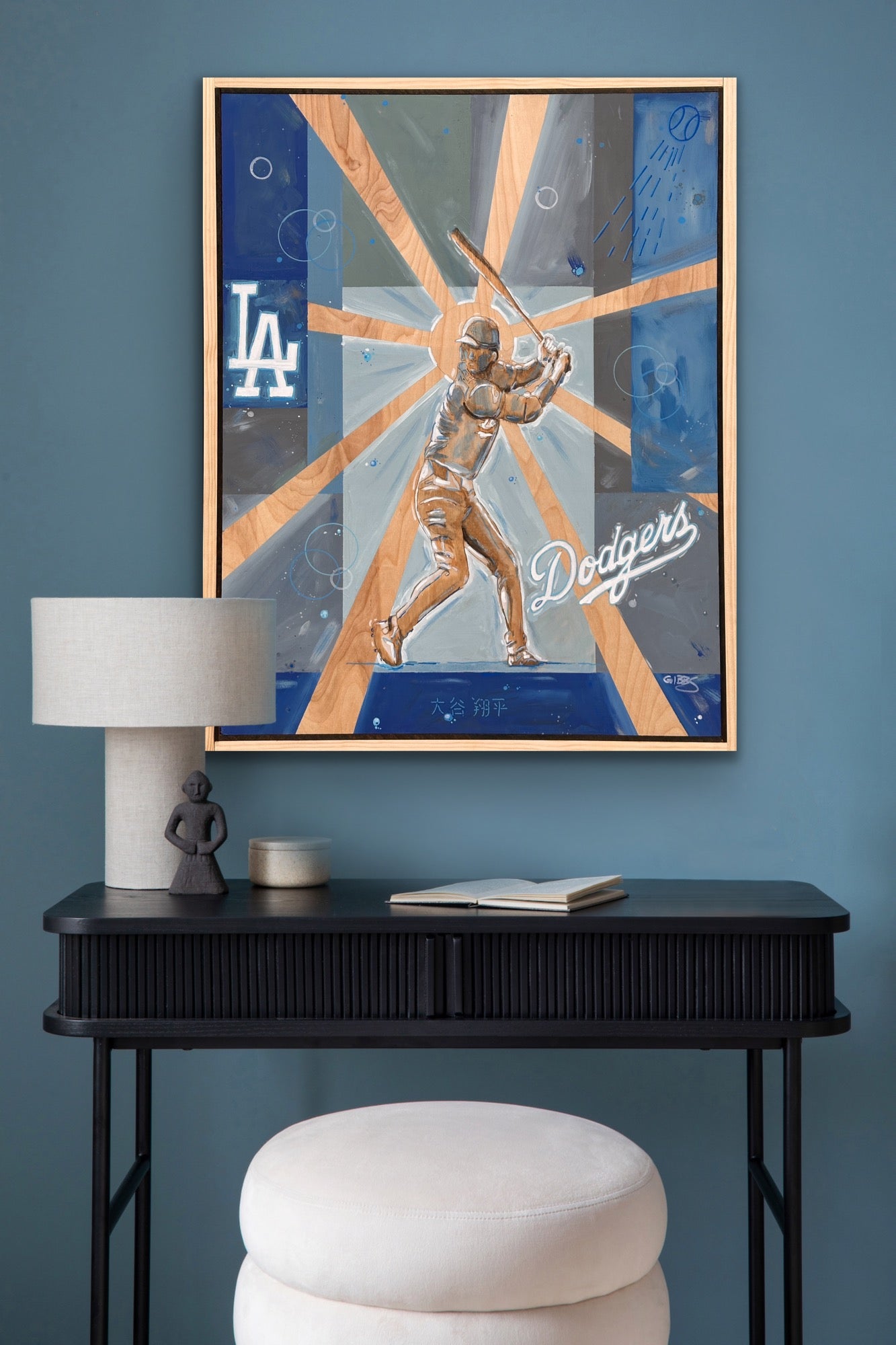 This vibrant Shohei Ohtani Dodgers painting celebrates the arrival of baseball’s most electrifying player to Los Angeles. Created by contemporary artist Nathan Gibbs, Sho-Time in LA blends bold baseball pop art with rich textures, natural wood rays, and dynamic motion. The figure of Ohtani takes center stage, framed by iconic Dodgers blue and Japanese characters (大谷翔平), capturing both his global impact and deep ties to Japanese MLB fans.
