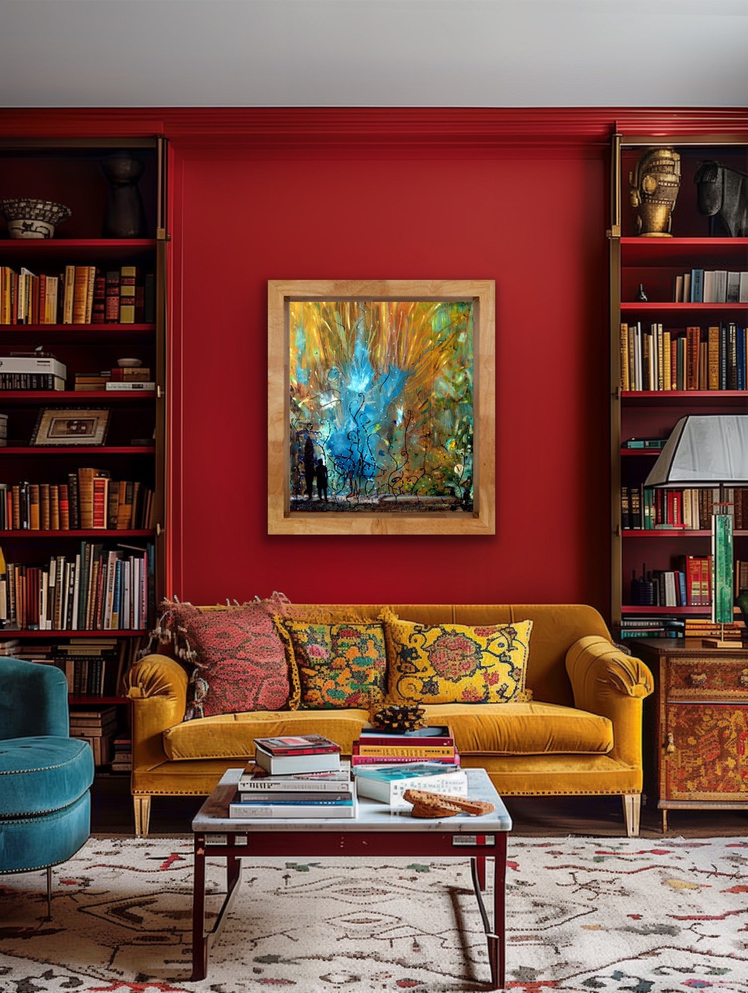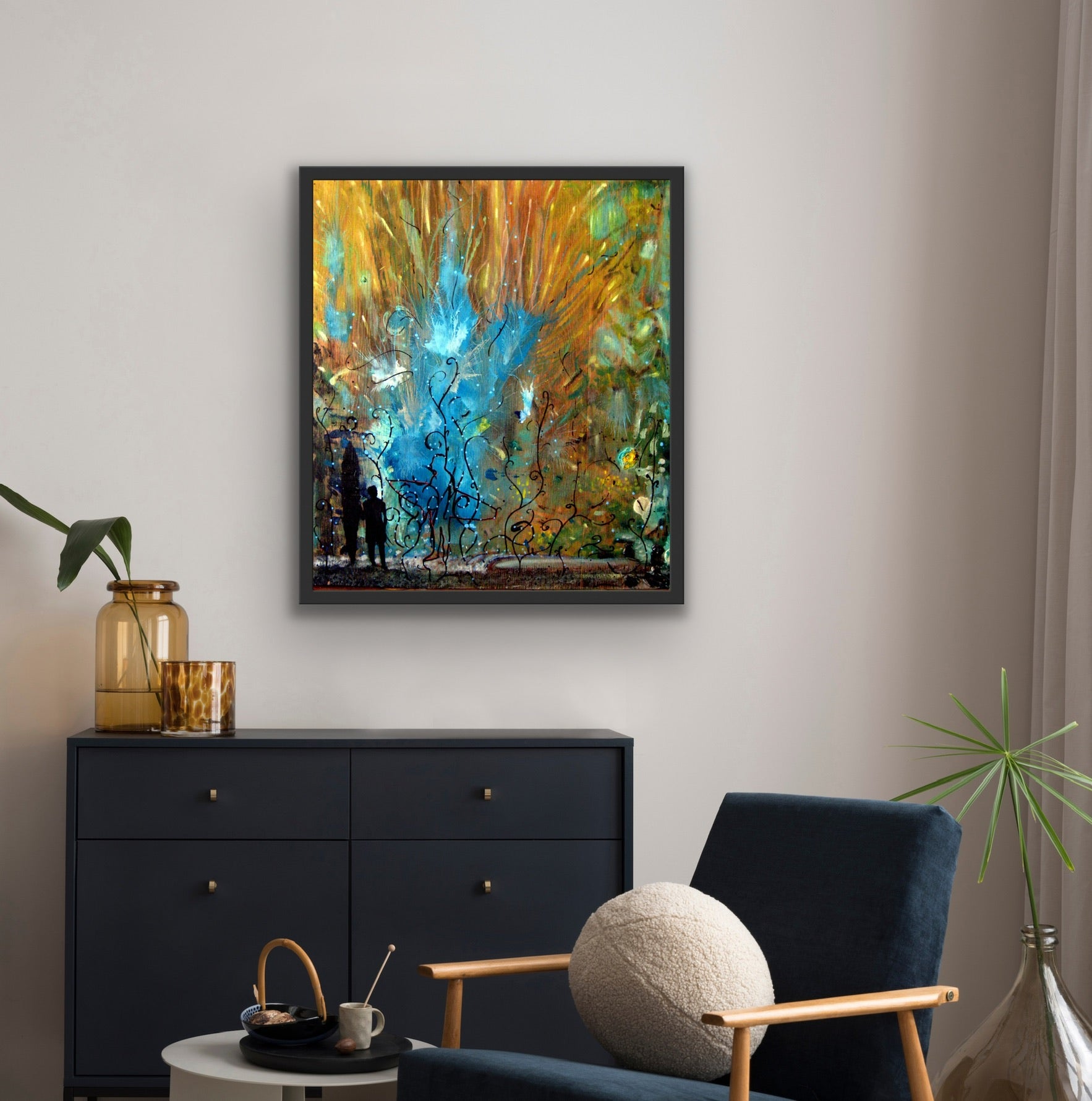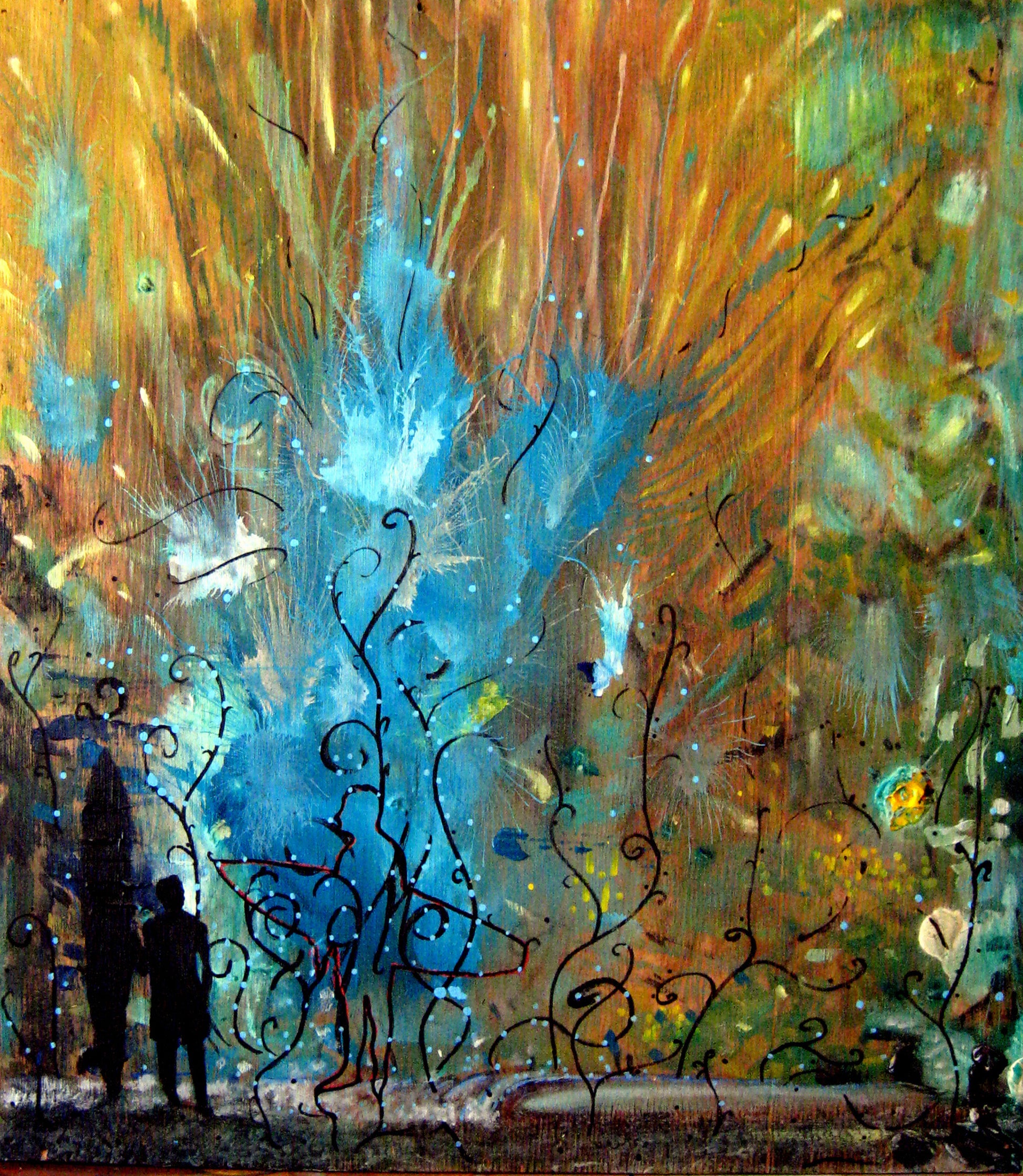 Fame or Same by Nathan Gibbs merges abstract nature with emotional storytelling. Silhouetted figures gaze upward through a surreal burst of sky-blue flora and golden energy. This mixed media piece evokes curiosity, innocence, and awe—perfect for collectors who appreciate layered symbolism and modern art rooted in environmental imagination and human connection.