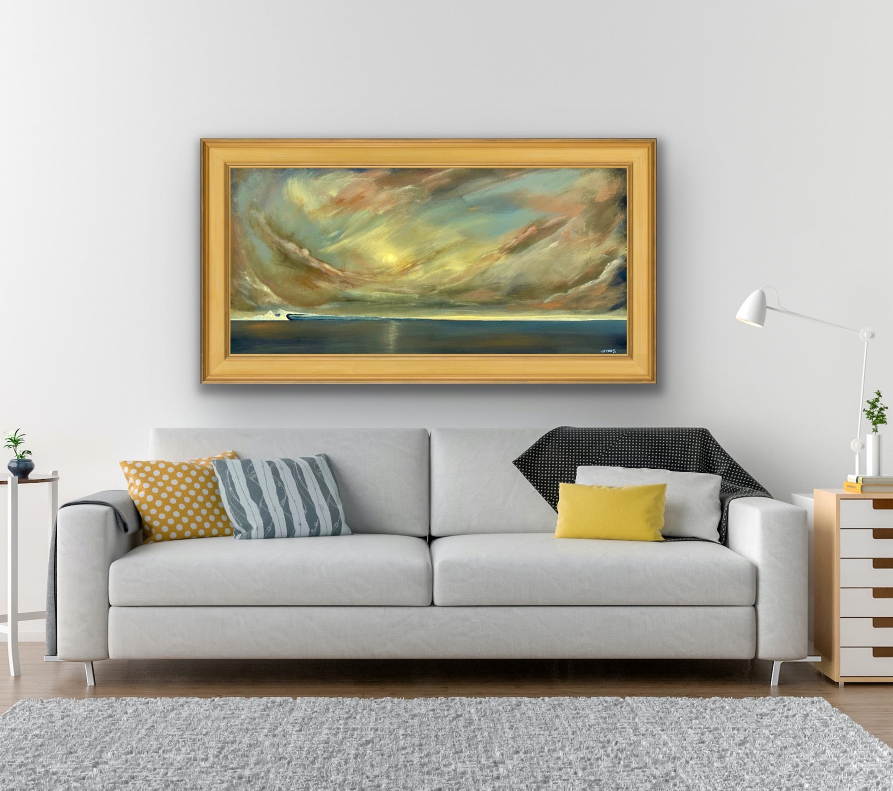 This painting channels the ethereal glow of dusk as it spreads across a vast ocean horizon. With a glowing wave breaking on the left and swirling golden clouds pulling toward the center, this piece captures the dynamic rhythm of wind and water. The warm pastel sky melts into steel blue sea, evoking calm and awe in equal measure. Ideal for collectors of coastal wall decor, ocean wave paintings, and surfer art, this scene brings both movement and stillness to life.