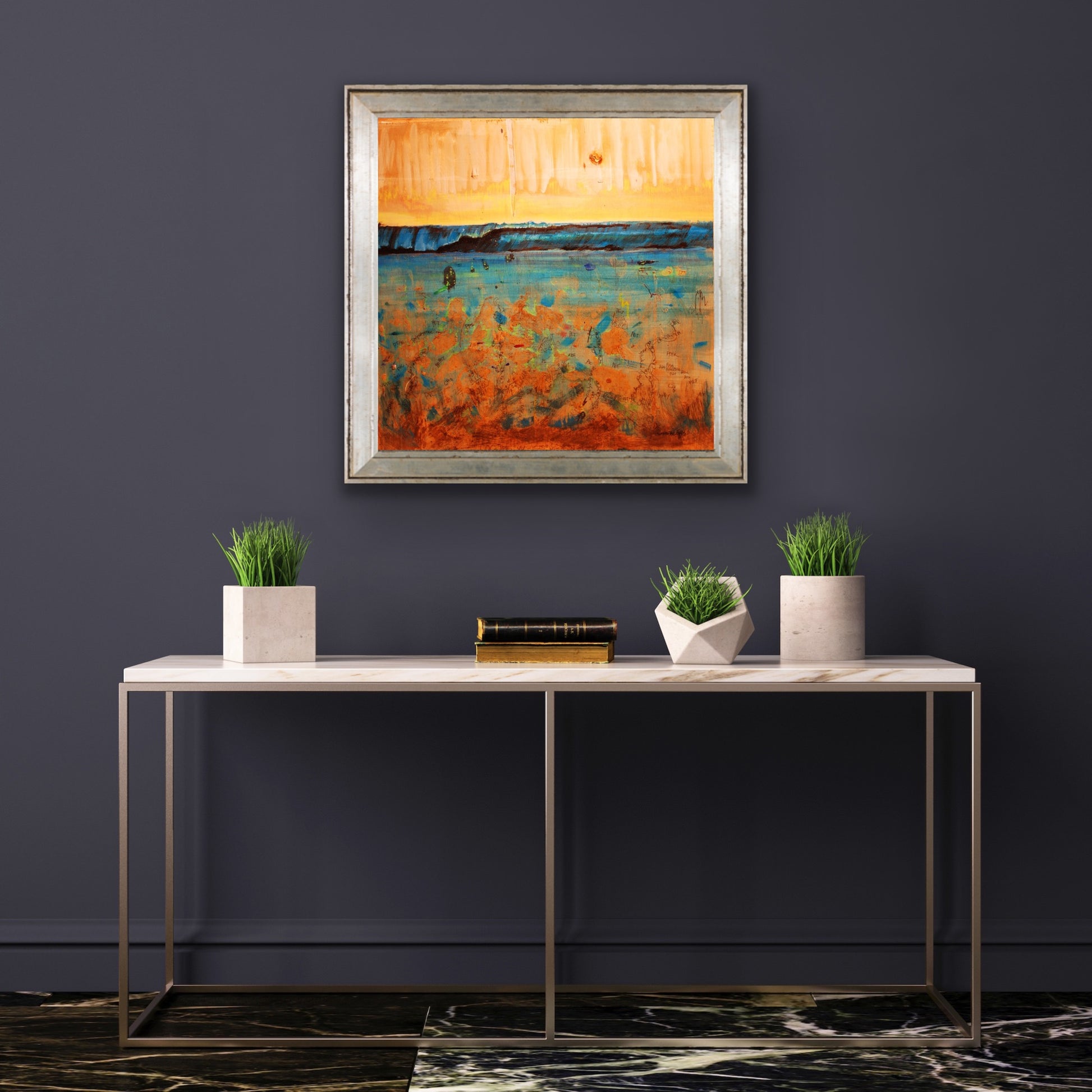 In “Gyre Reef” Nathan Gibbs transforms the tranquil image of a coastal horizon into a poignant commentary on environmental intrusion. A glowing sun sets over a deep blue wave, while the foreground reveals swirling abstract textures of rust, orange, and cobalt—an artistic representation of pollutants bleeding into the sea. Subtle inscriptions like “PET,” “ABS,” and “PVC” nod to the hidden plastics and chemical traces that define modern runoff.