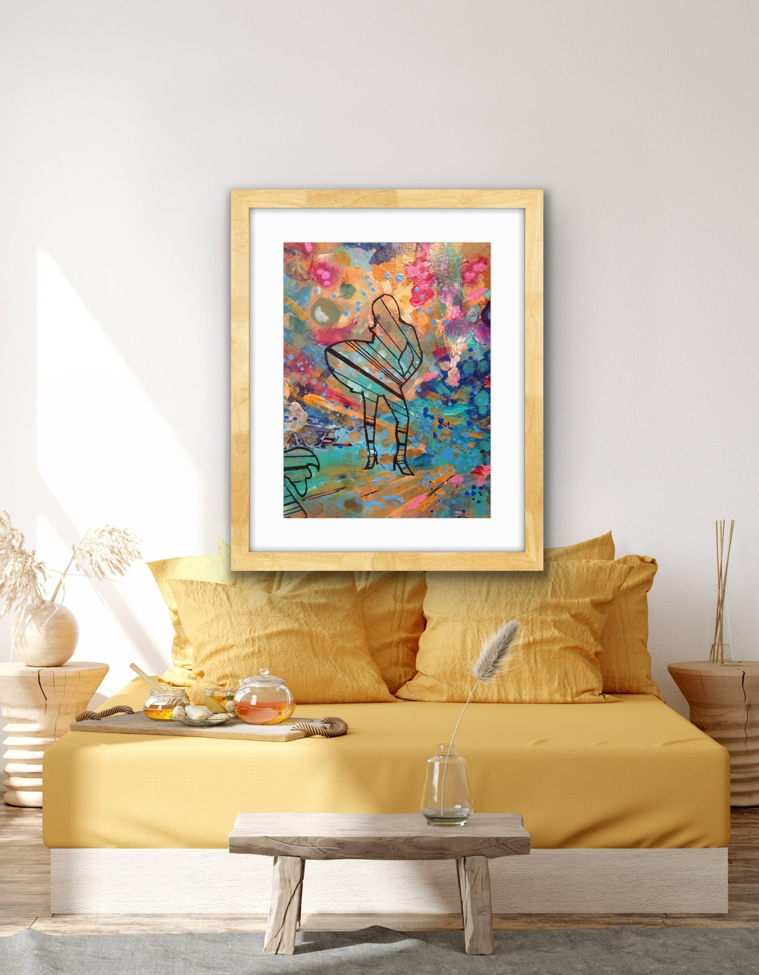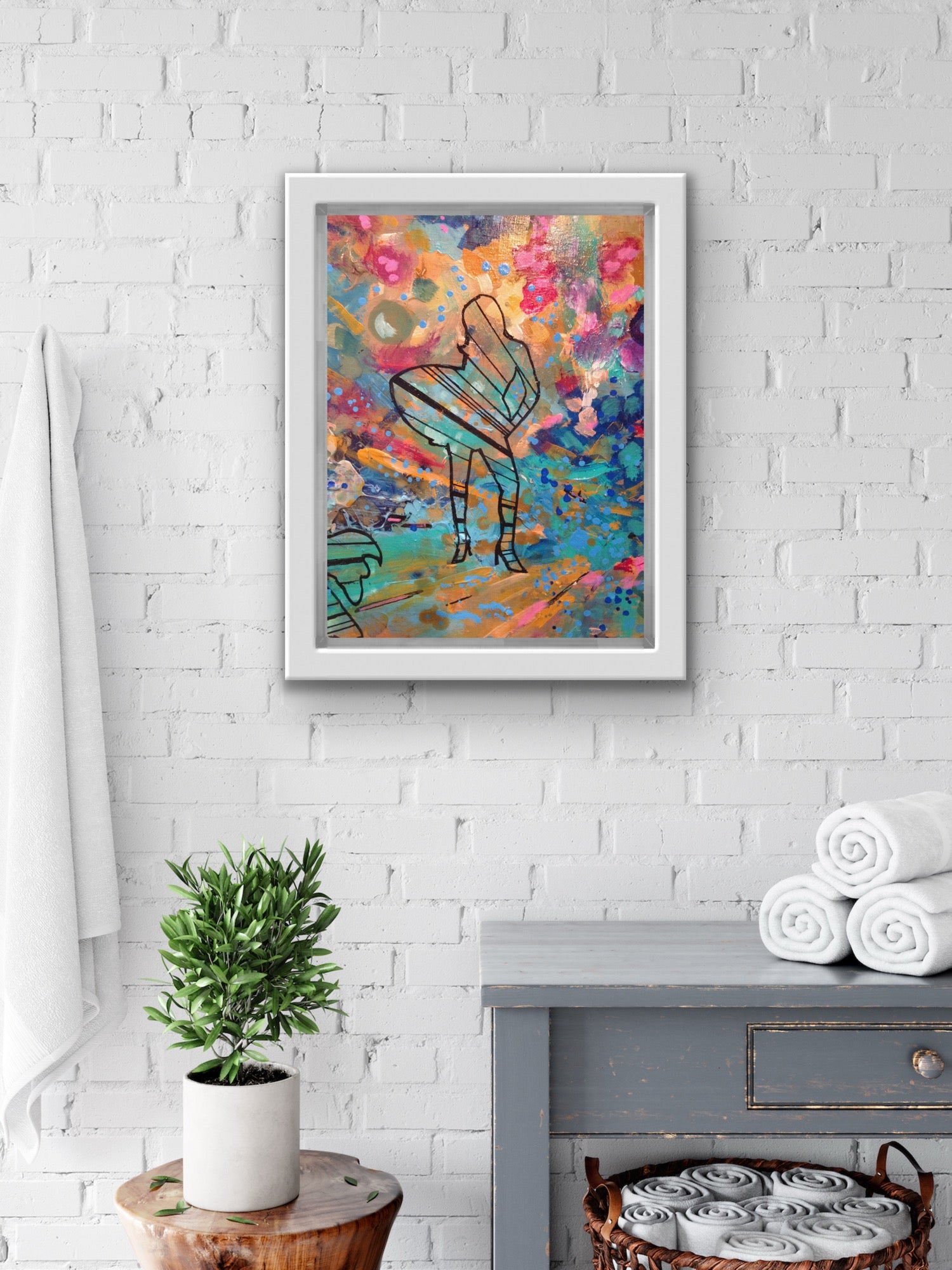 A vibrant surf silhouette explodes with color in Nathan Gibbs’ energetic mixed-media painting. Bold outlines, feminine form, and abstract expressionist splashes collide in a celebration of surf culture and individuality. Perfect for collectors of coastal, surf-inspired, or pop-expressionist art. A stunning tribute to movement, empowerment, and vibrant West Coast energy.