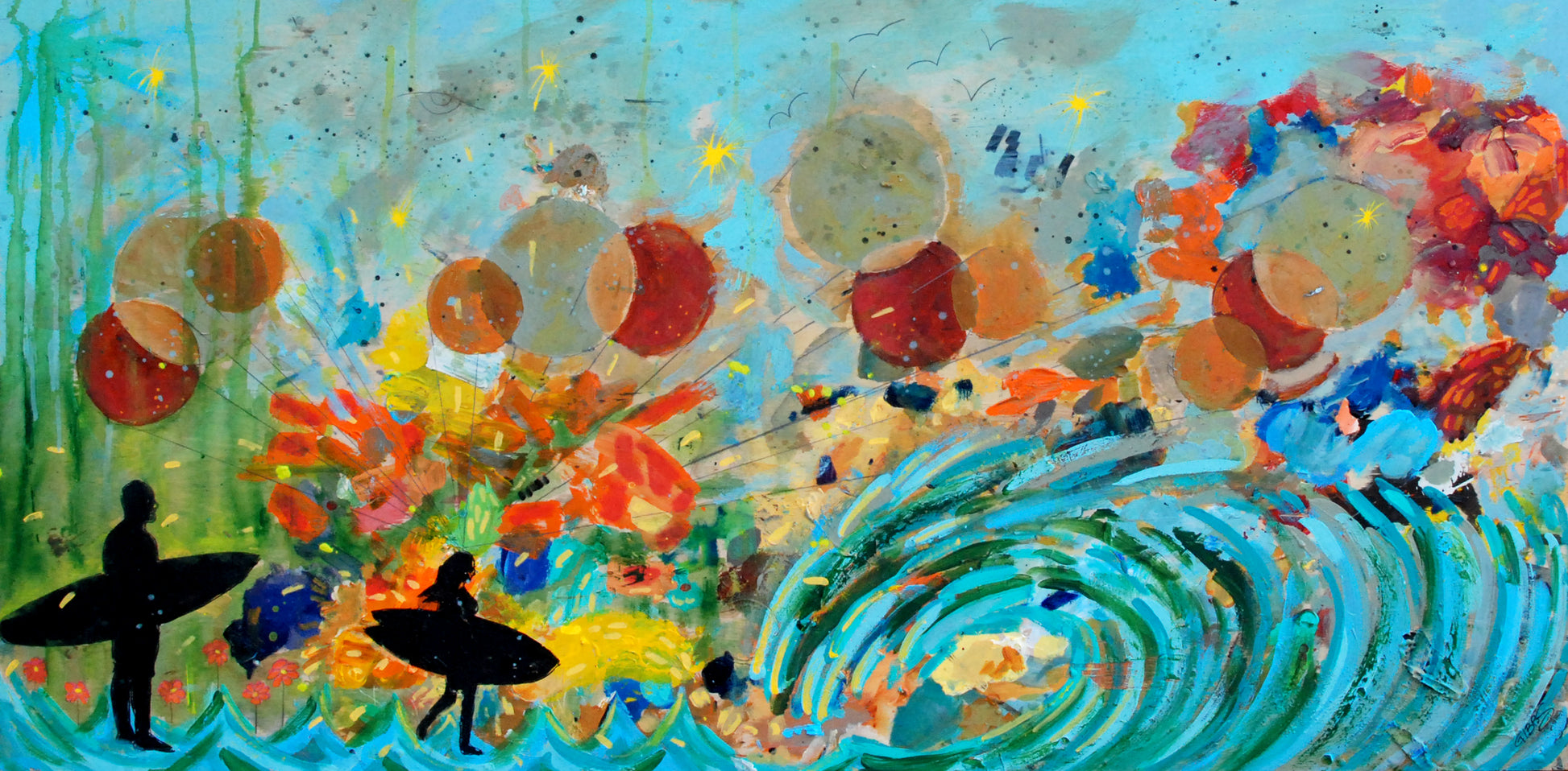 Ladies first by Nathan Gibbs captures two surfers amid a surreal coastal dreamscape. Explosions of vibrant color, balloons, waves, and abstract florals create a joyful, emotional rhythm. This contemporary surf art bursts with energy and imagination—perfect for ocean lovers, beach décor, or collectors seeking bold, expressive coastal wall art.