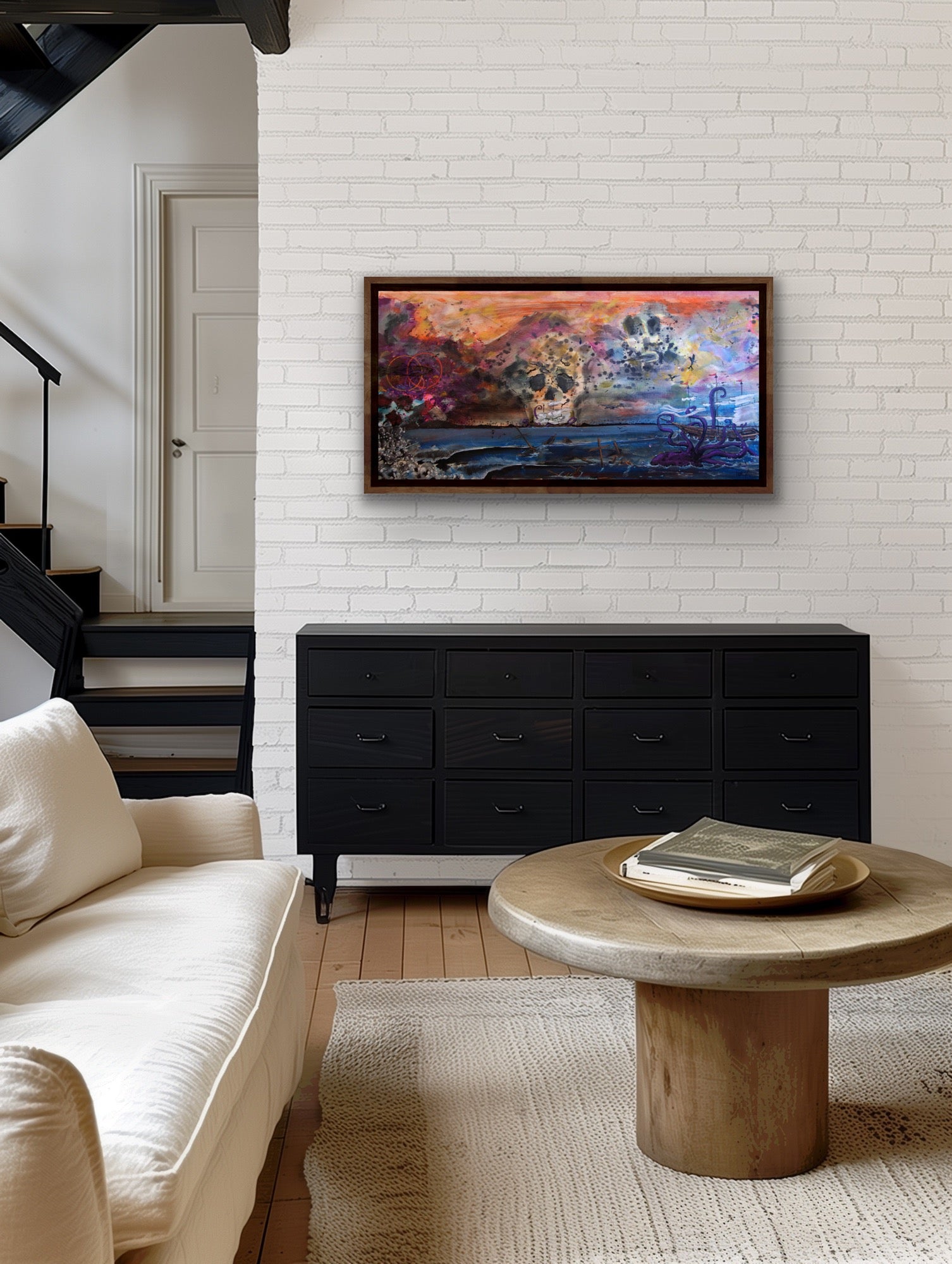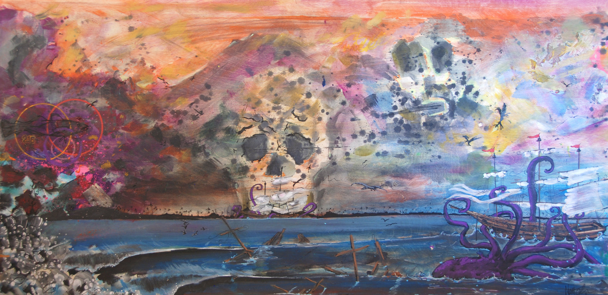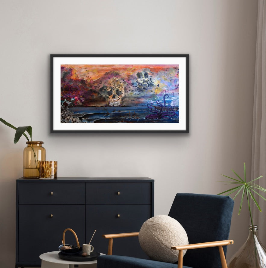 Oh My Cod, by Nathan Gibbs is a surreal seascape where storm clouds form skulls above a ghostly ocean. A kraken attacks a wooden galleon under apocalyptic skies. This painting tells the story of the overfishing of the cod stock in the Atlantic and the ocean fighting back against it. Blending horror and fantasy, this nautical art captivates collectors of dark ocean art, mythological creatures, and post-apocalyptic seascapes.