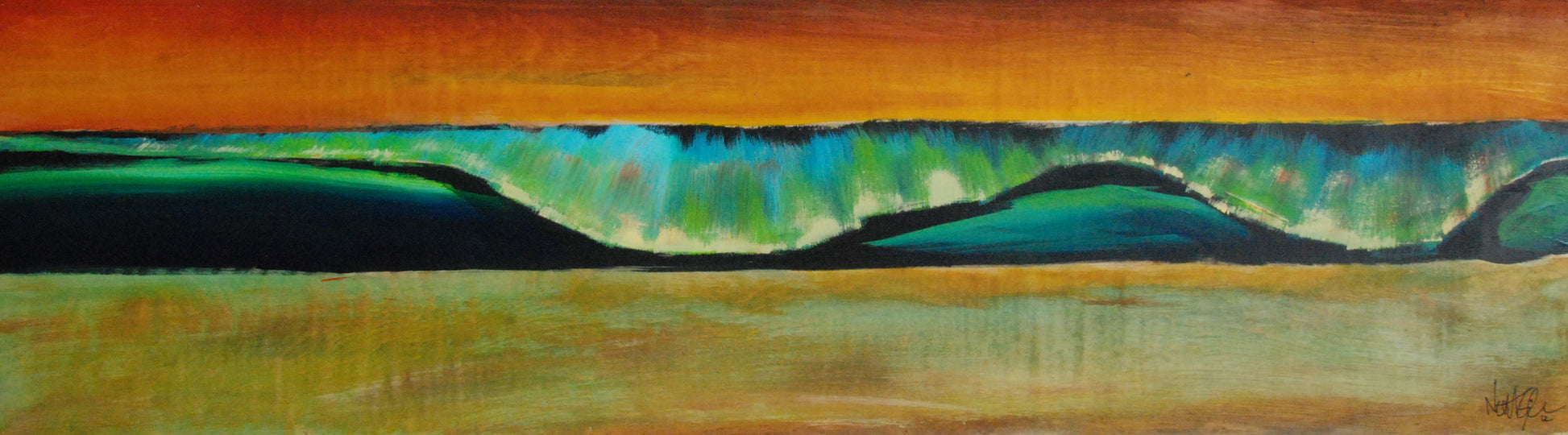 The Dark and Light series takes a modern simplistic approach to a classic beach and ocean scene. I use a dark under layer behind the waves, and a lighter wash on the sky and foreground that allows the natural wood grain to be a part of the painting. I also use perspectives and colors in variations and combinations that allow the collector to find that perfect piece.