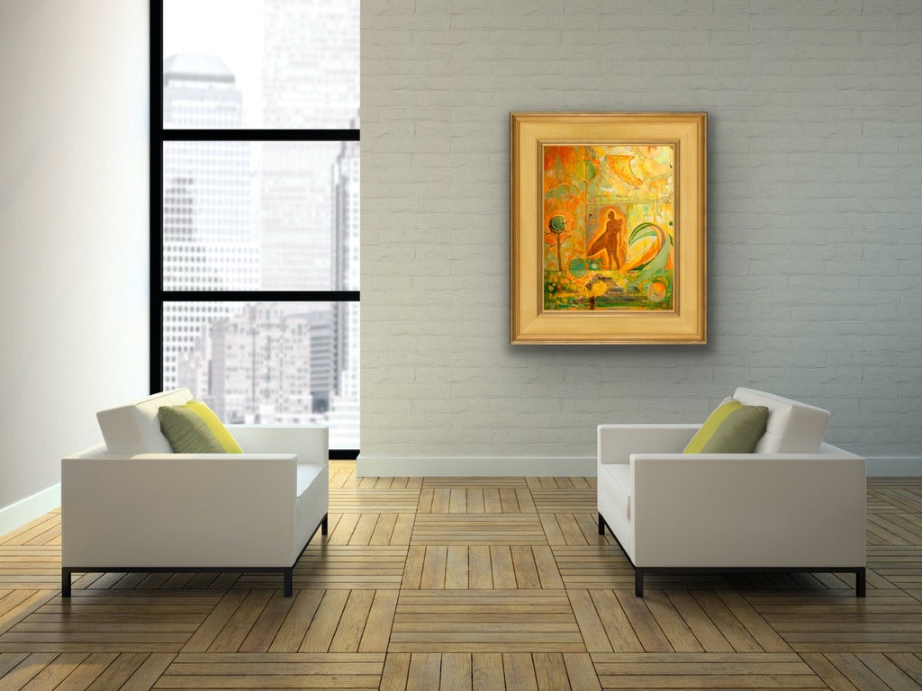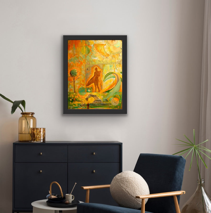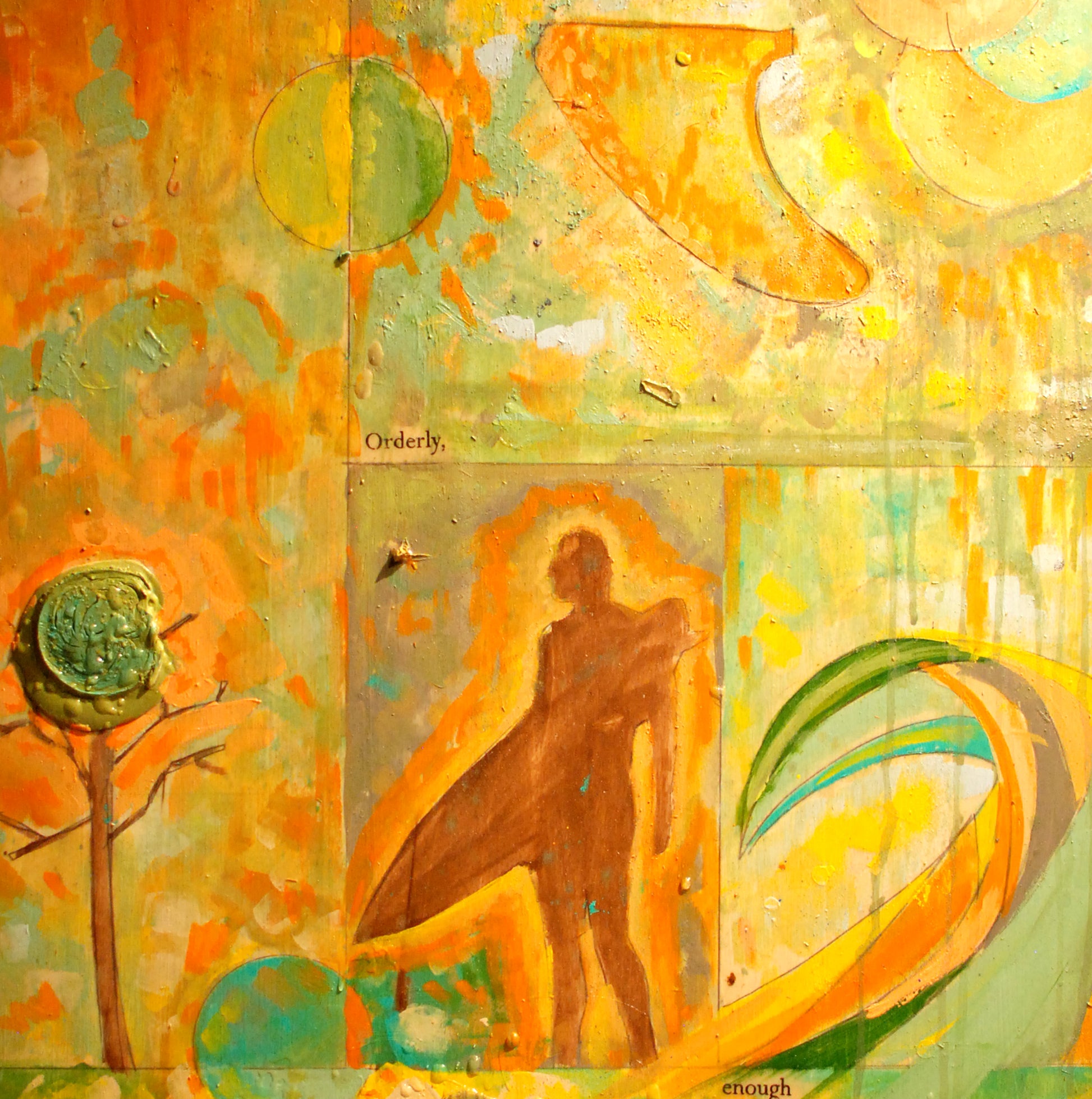 “Orderly Enough” by Nathan Gibbs blends surf culture with surreal symbolism. A glowing surfer figure stands at the center of abstract waves, topographic maps, and circular motifs. With warm earth tones and embedded text, this coastal mixed media artwork is ideal for collectors seeking conceptual surf art or California dreamscape pieces.