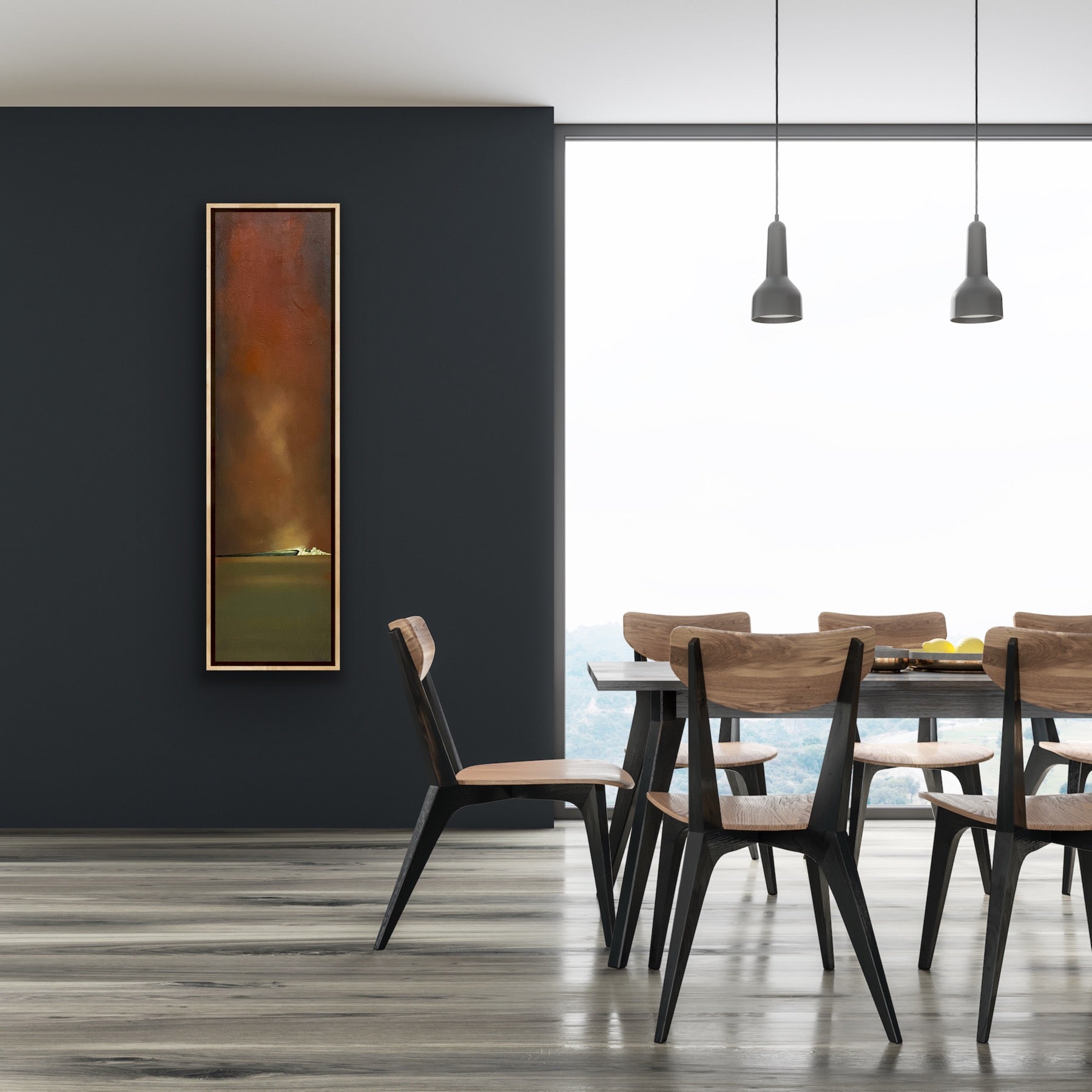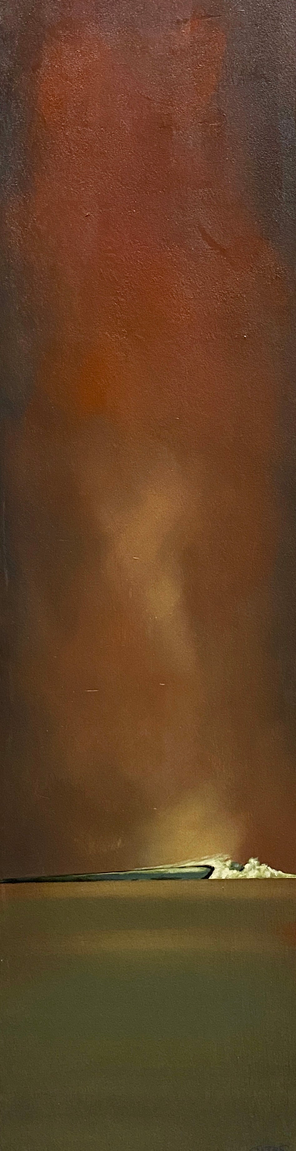 Passionately delivers a striking composition where vertical drama meets oceanic calm. This tall-format wave painting features a glowing orange and ember-red sky, fading upward into smoky shadows, while a single breaking wave slices through the horizon like a whispered secret. The deep bronze tones and luminous surf create a bold yet meditative piece—perfect for collectors of coastal art, modern surf art, or minimalist beach art. The narrow canvas lends itself beautifully to entryways, hallways, or intimate spaces looking for a vertical statement in nautical wall art or ocean decor.