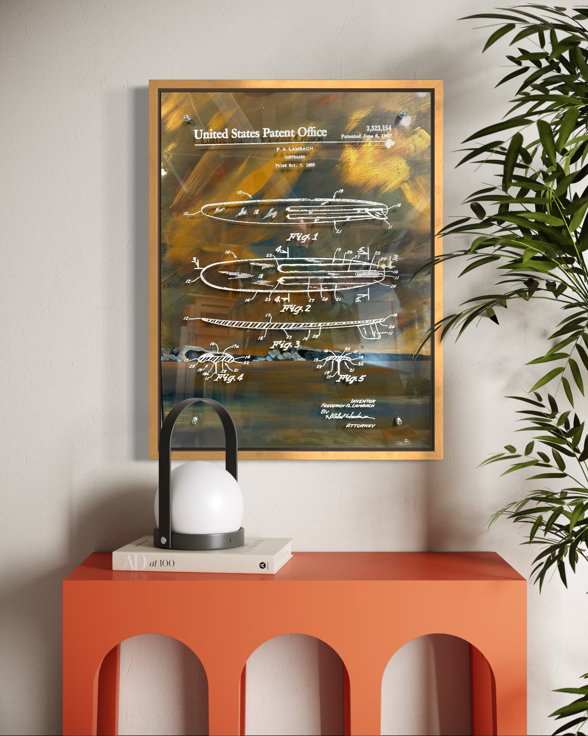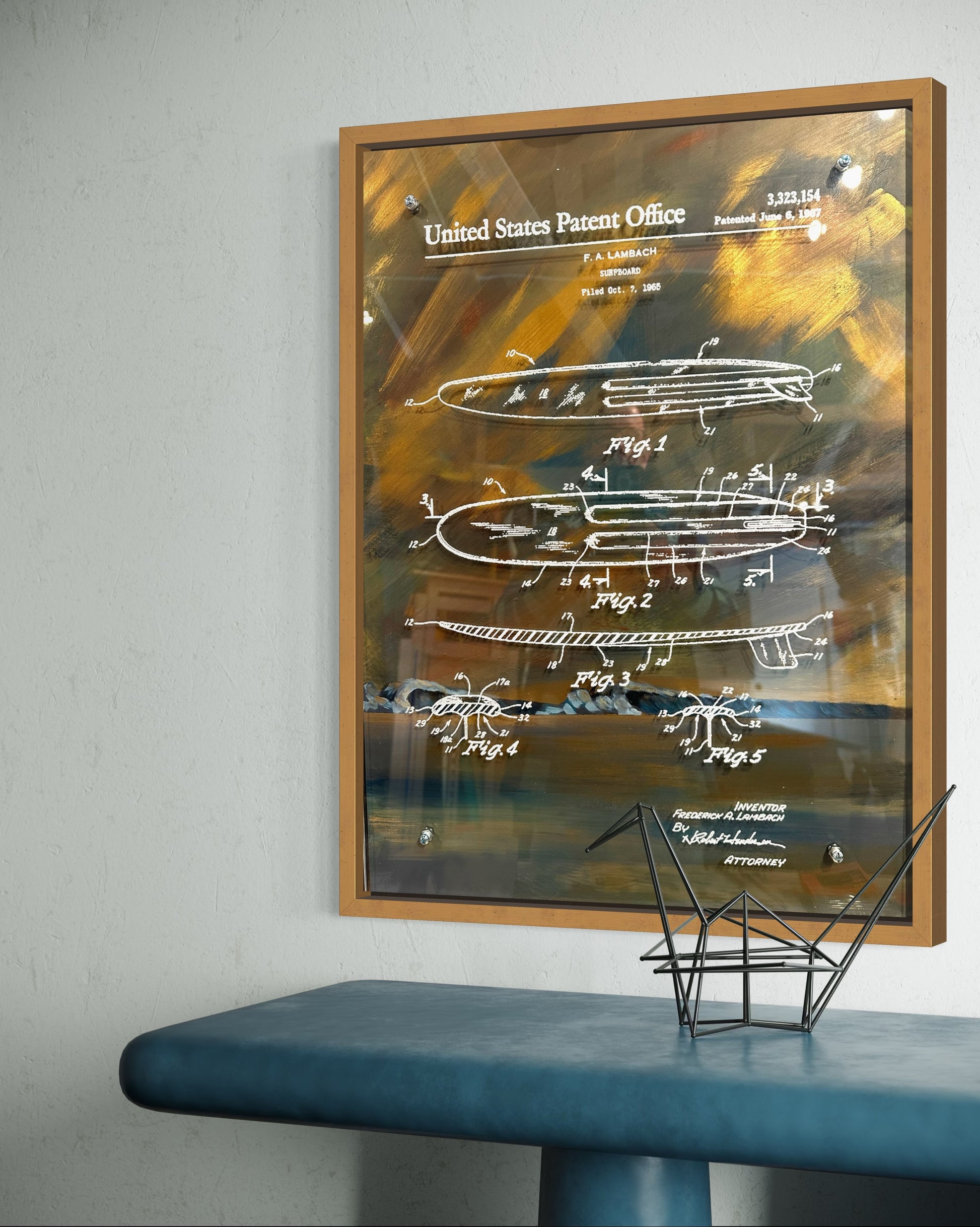 What you’re looking at is not just surf art—it’s surf history, reframed as contemporary luxury. A mid-century U.S. surfboard patent, rendered in crisp white schematic linework, floats over a richly layered coastal atmosphere. The background feels like late afternoon at Malibu or San Onofre—warm ochres, deep marine blues, and a soft Pacific haze—while the patent drawings bring precision, lineage, and quiet authority.
