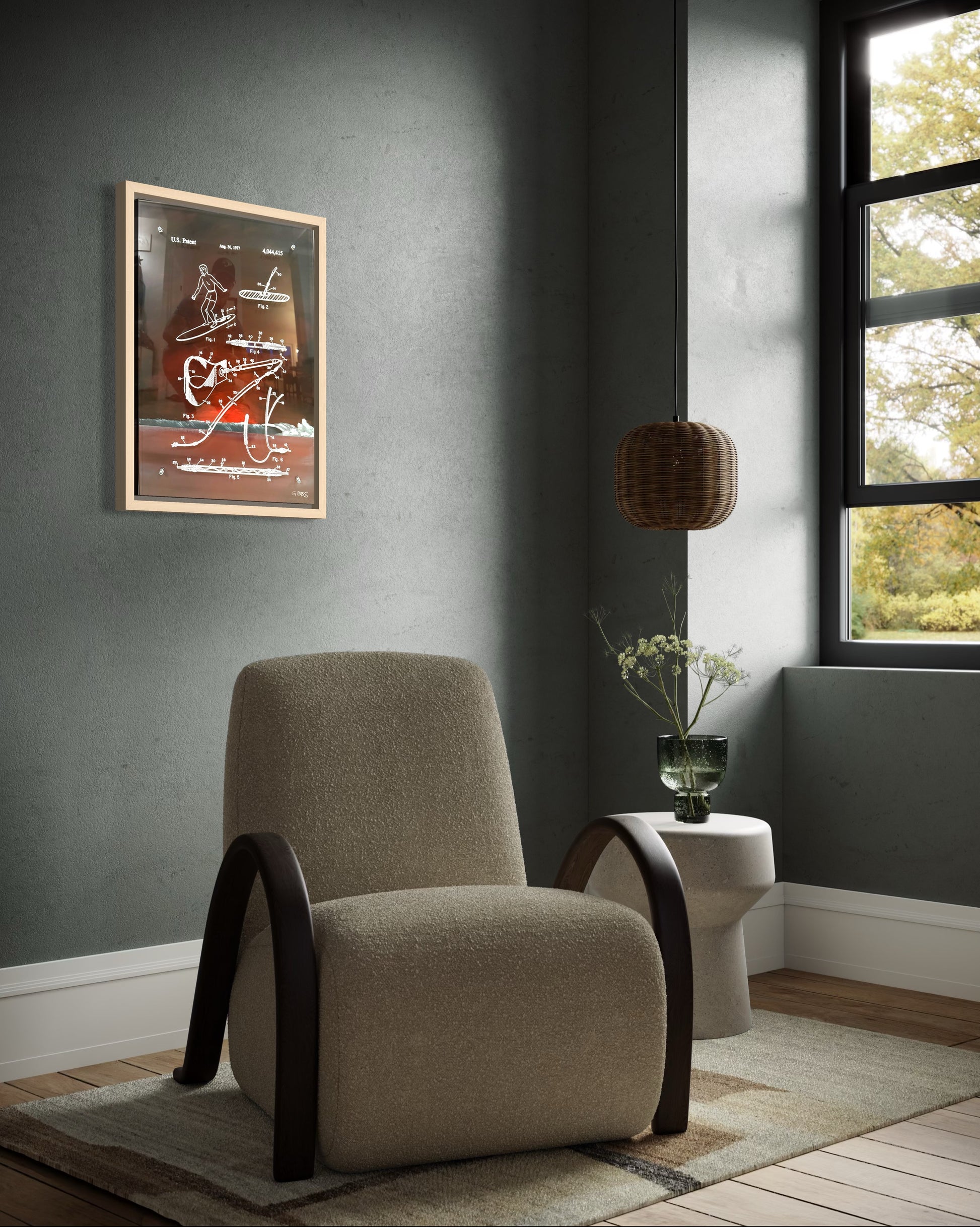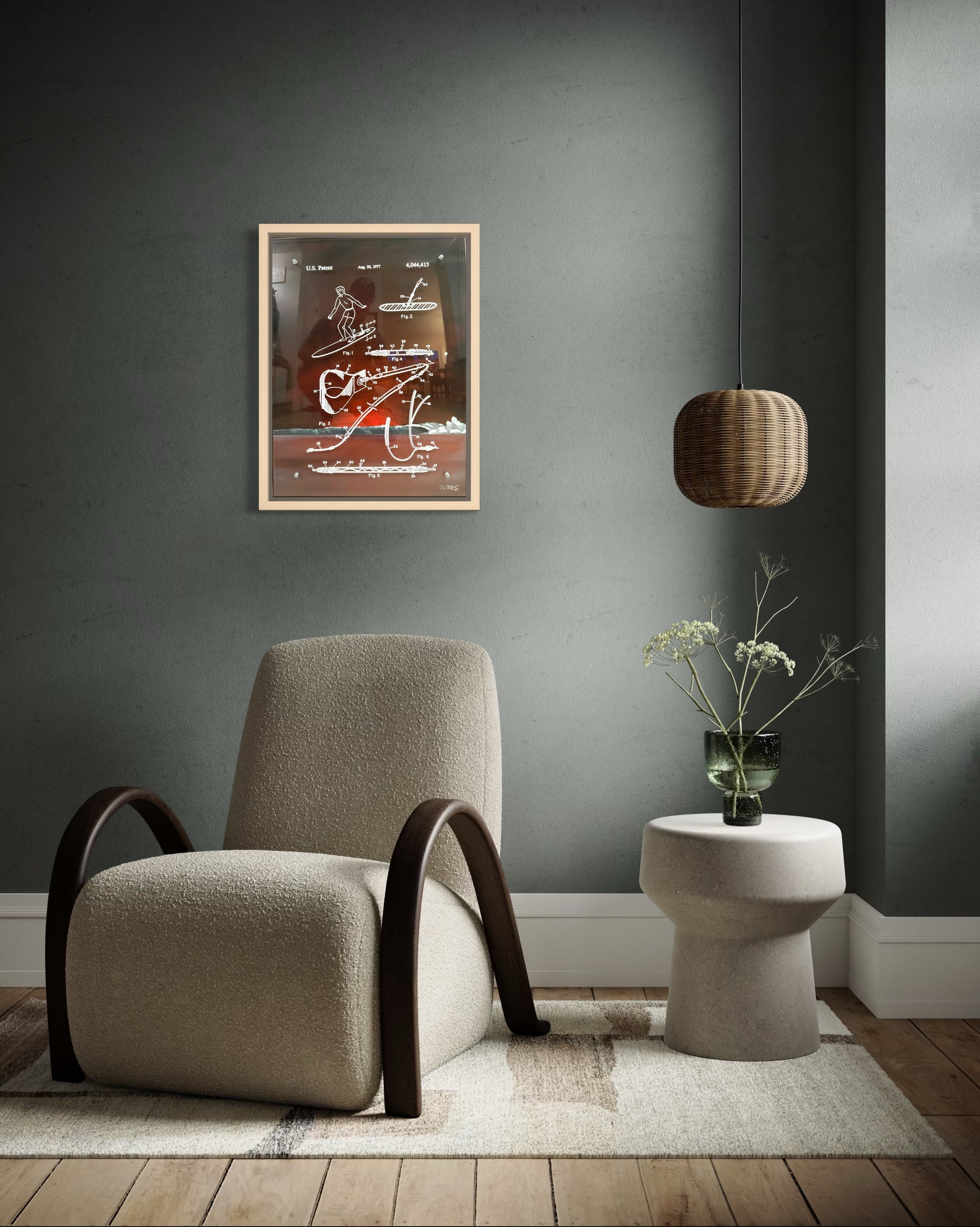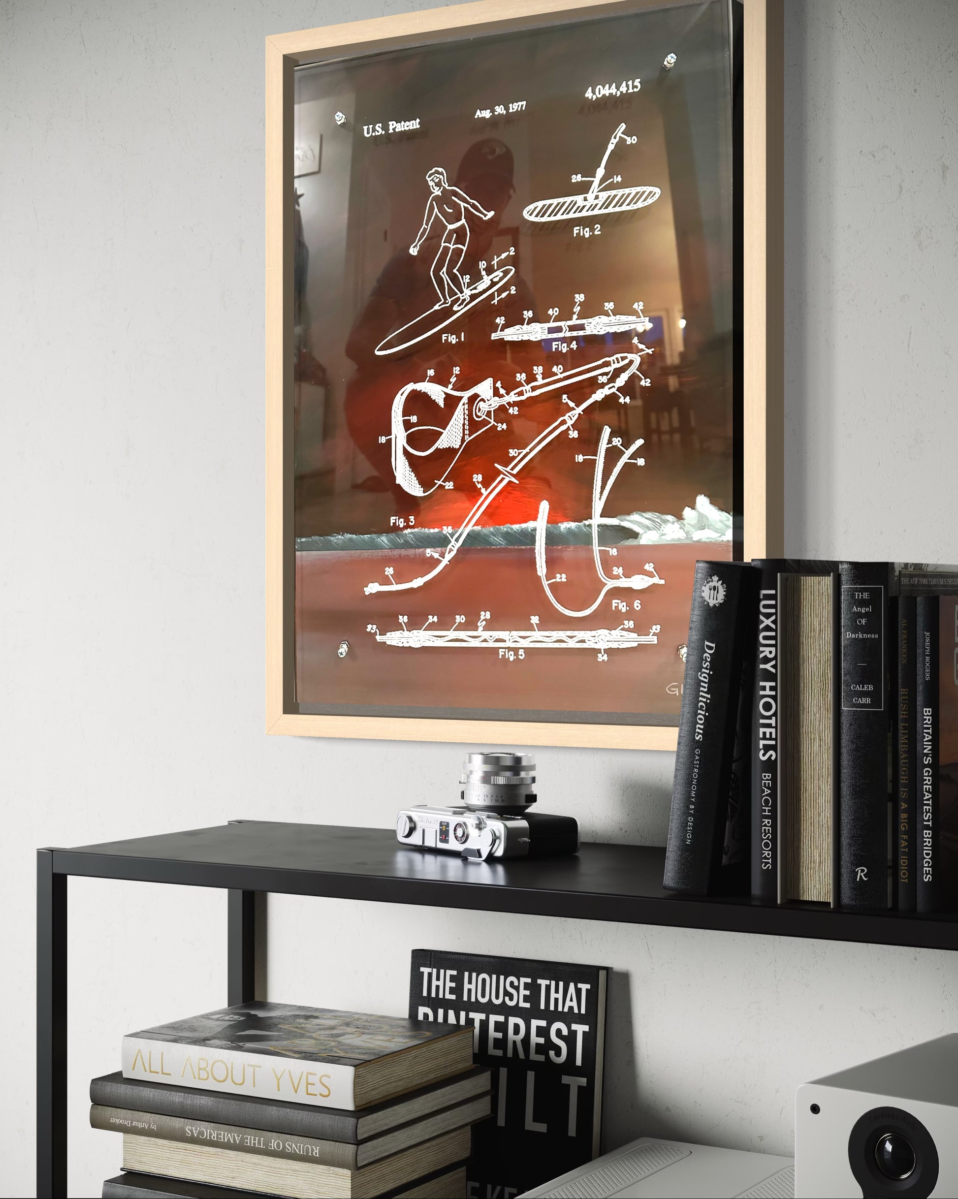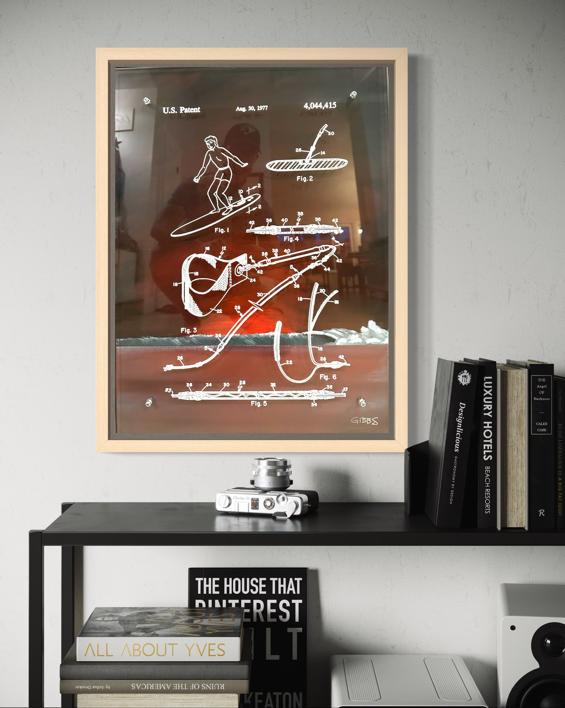 This piece is a striking fusion of California surf culture and technical innovation. Featuring the original 1977 U.S. Patent drawing for the surf leash, it captures one of the most important inventions in surf history and elevates it into fine art. The crisp white schematic lines float over a deep, cinematic red-ocean backdrop, creating a powerful contrast that feels equal parts modern, nostalgic, and iconic.