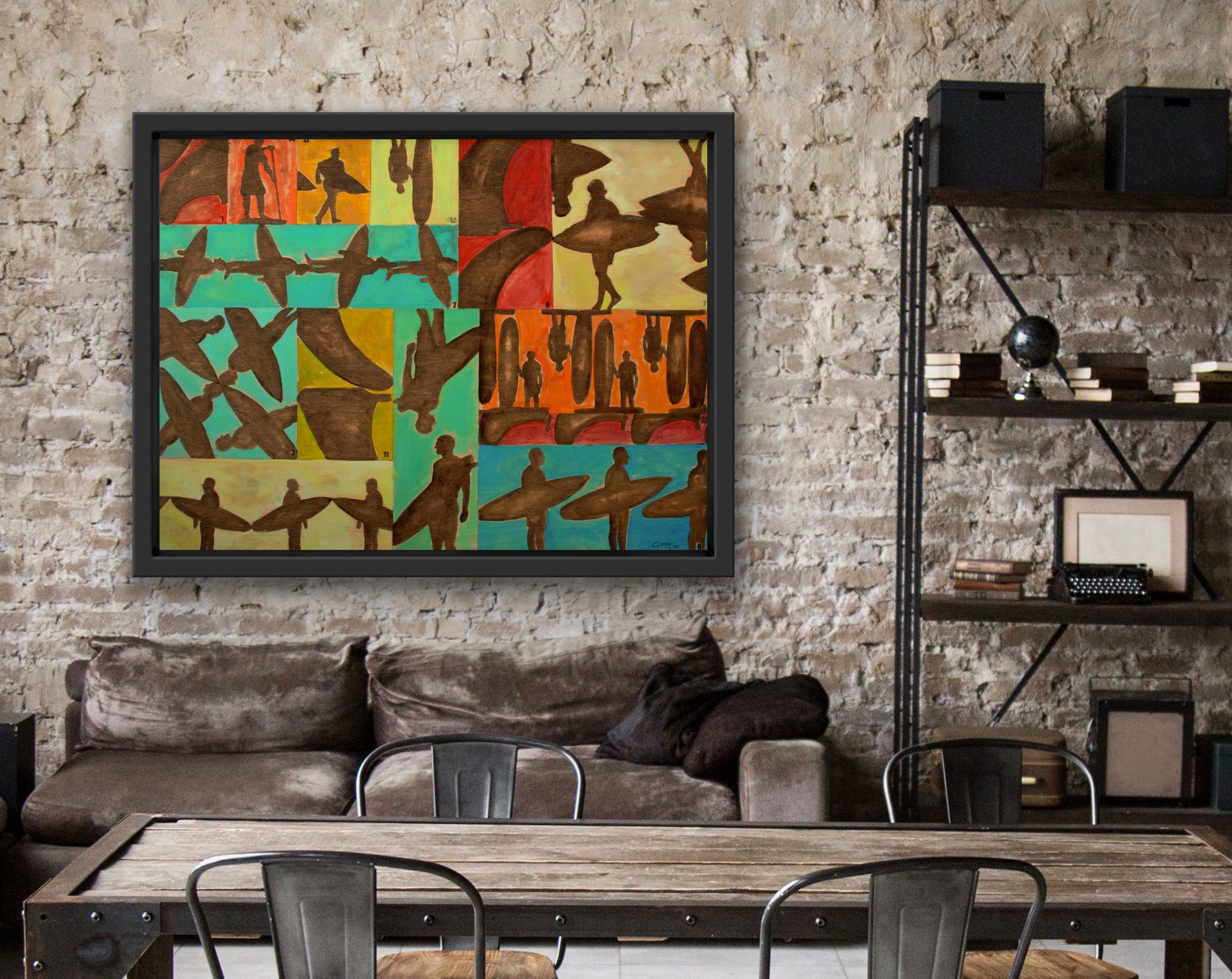 Each square holds its own energy while contributing to a greater visual harmony, like a comic strip or a surfer’s journal. The numbered panels suggest both order and spontaneity—reflecting the structure of wave sets and the unpredictability of the ocean. This painting is ideal for surf enthusiasts and collectors who seek a bold, design-forward homage to coastal life.