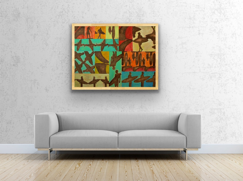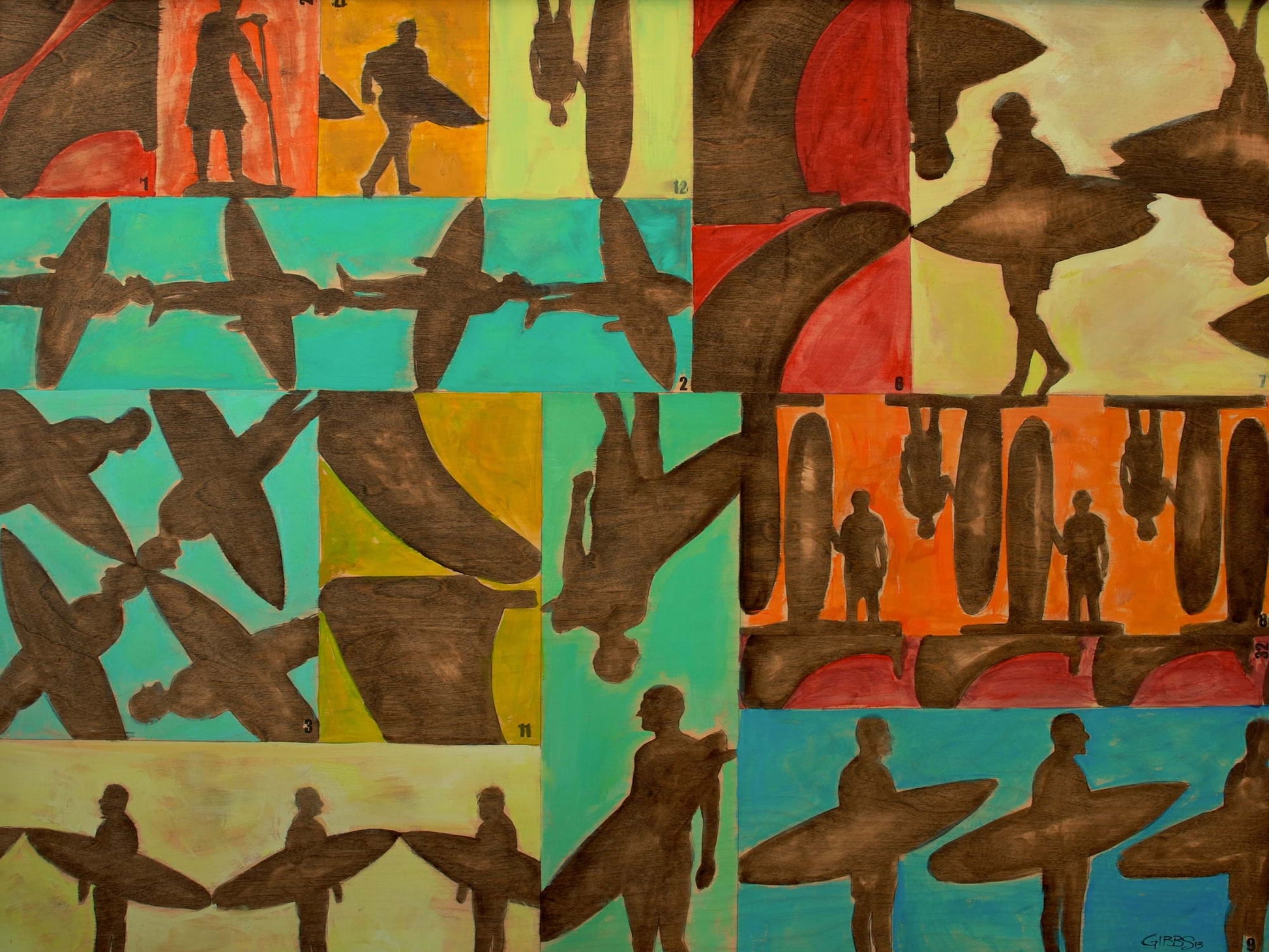Nathan Gibbs’ “Patterns of Surf” transforms the beach into a rhythmic visual chant. With each block portraying a distinct surfer silhouette—walking, standing, paddling, or simply waiting—this piece becomes a meditation on the timeless ritual of surf culture. The repetition of forms, set against a vibrant grid of turquoise, sand, ochre, and coral, evokes both vintage surf posters and modernist abstraction.