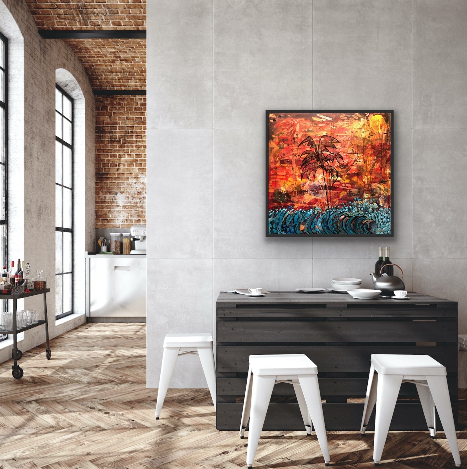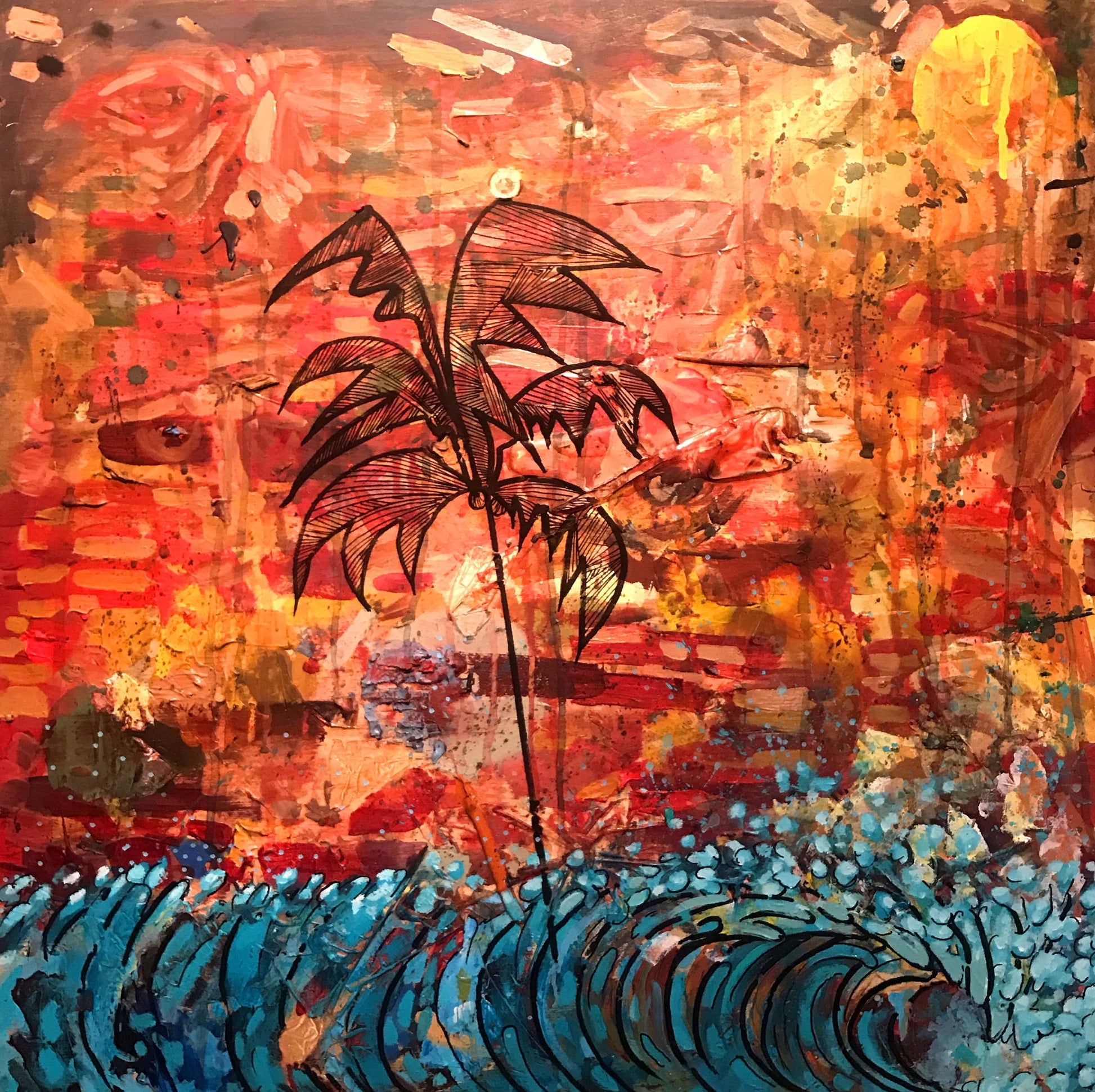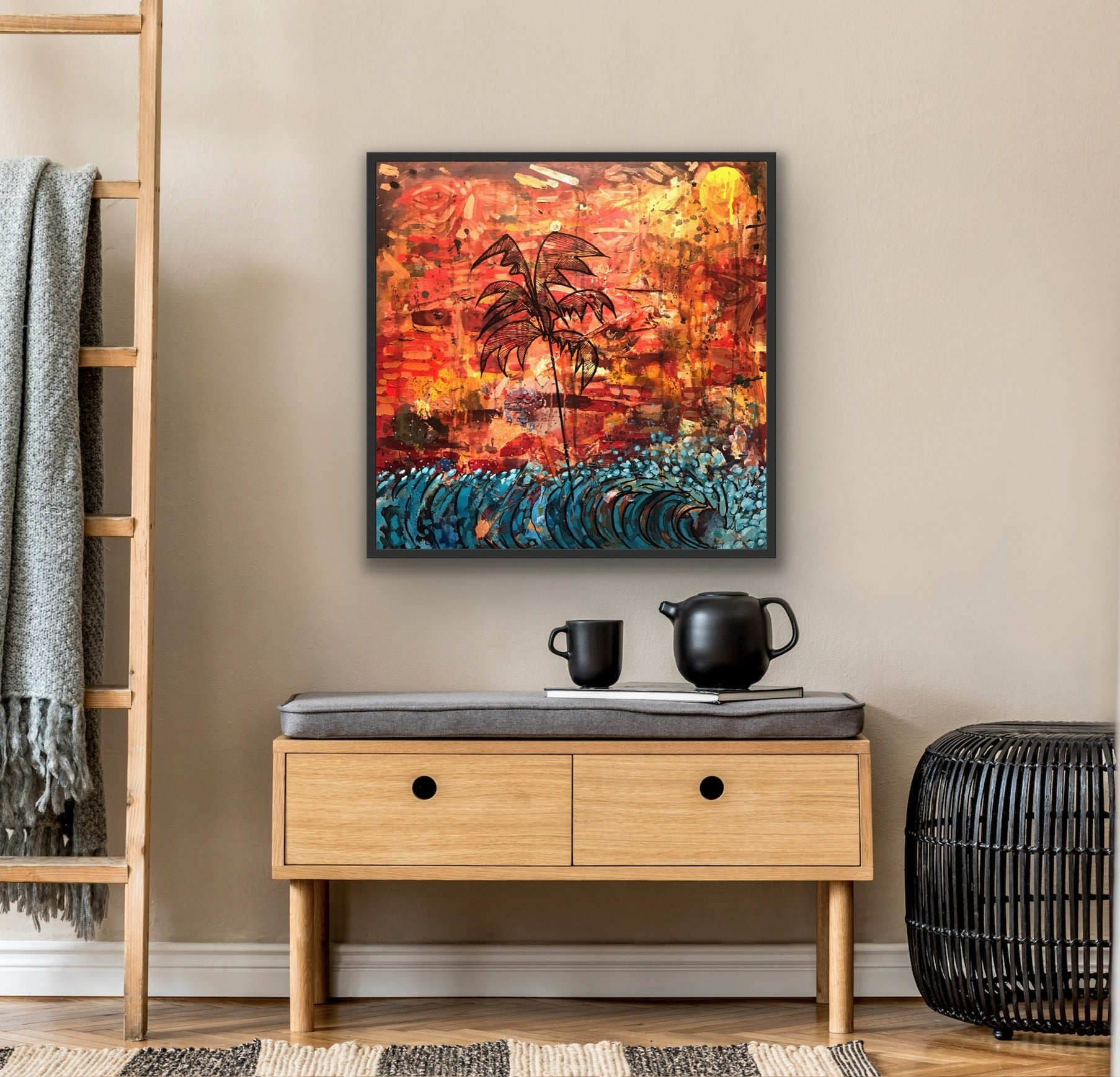 This piece by Nathan Gibbs captures a surreal seascape where crashing waves collide with fiery skies. Bold palm trees stand defiant against a backdrop of hidden faces representing all if the evil people who are denying climate change and costing coastal lowlands and entire island nations to be at risk of destruction. This modern surf art evokes passion and introspection, making it a striking centerpiece for collectors of coastal or contemporary art.