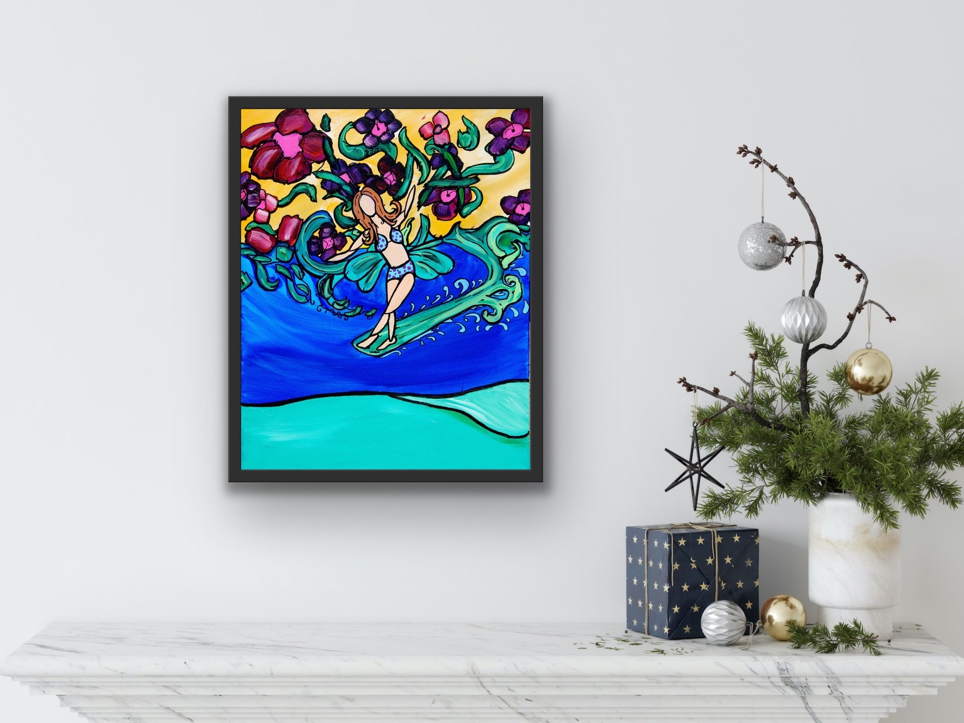 Perfect for lovers of surf culture, fantasy art, or vibrant beach décor, this piece captures the magic of the ocean through a playful lens. Ideal for brightening any room, this artwork blends bold lines and lush color with a unique storybook charm.
