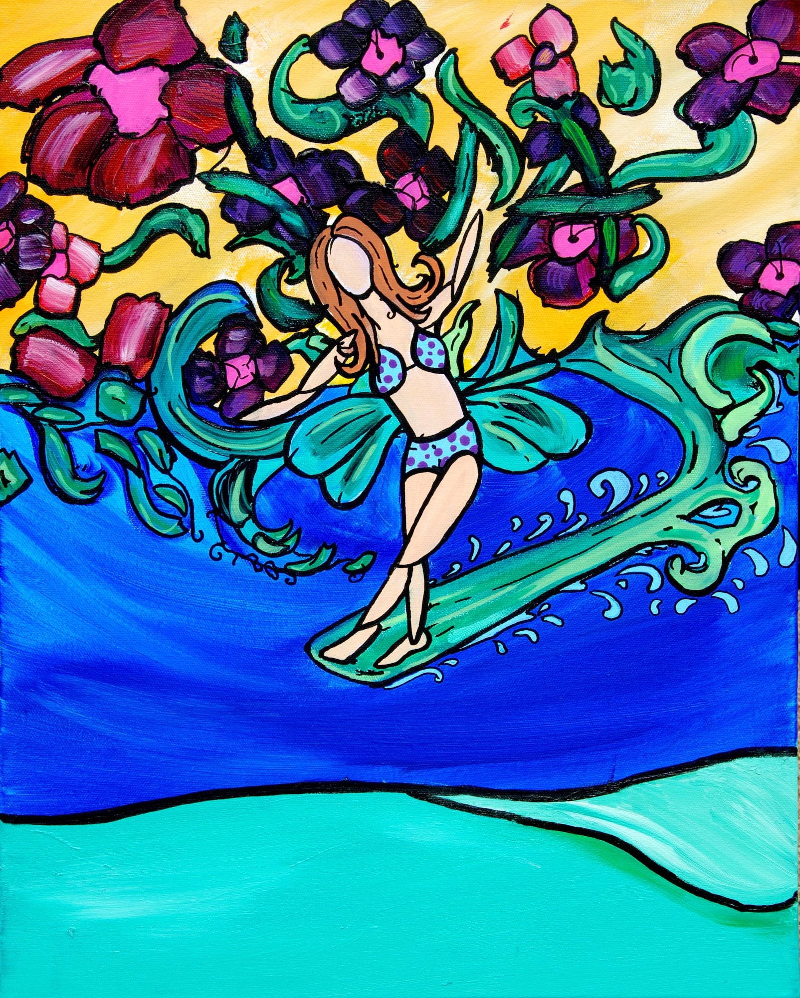 “Surf Girl Too” by Nathan Gibbs is a joyful celebration of fantasy, surfing, and feminine freedom. This enchanting painting features a faceless surf fairy gracefully riding a stylized wave, surrounded by a cascade of oversized tropical flowers. With vivid purples, teals, and sunlit yellows, the scene bursts with energy and imagination. Her wings echo the curves of the wave, suggesting harmony between nature and motion.