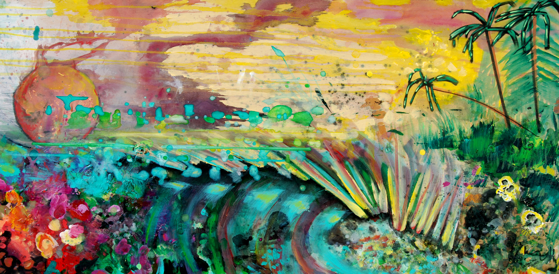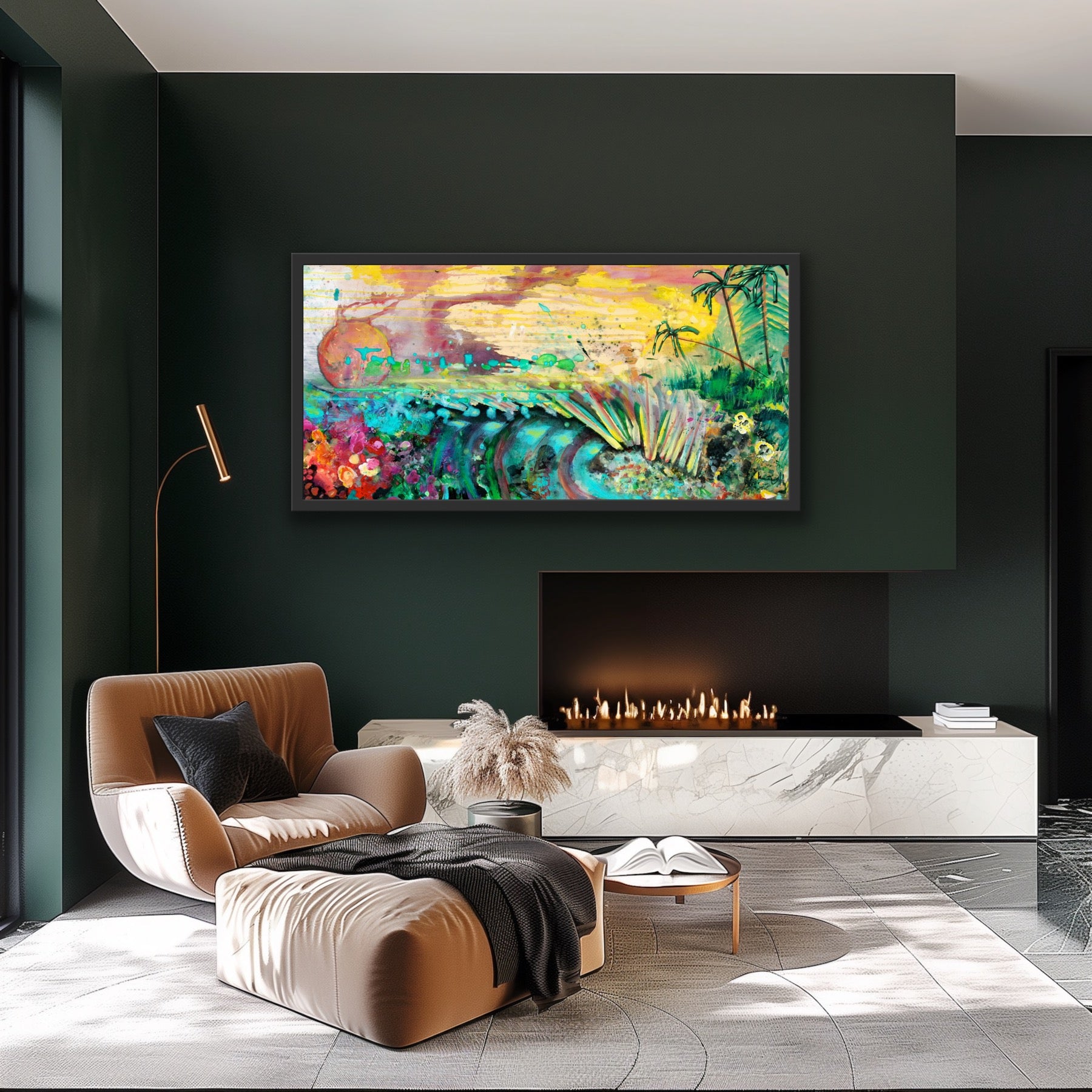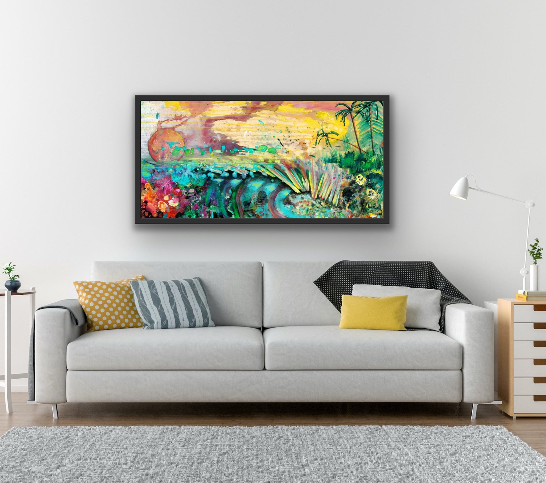 This work by Nathan Gibbs bursts with explosive color and movement. A crashing wave collides with a radiant sunset, vibrant florals, and windswept palms. This tells how agricultural runoff in Australia is destroying the Great Barrier Reef and the ocean is fighting back. Perfect for collectors of surf art, tropical beach décor, or expressive coastal paintings that radiate warmth, energy, and the dreamlike beauty of island life.
