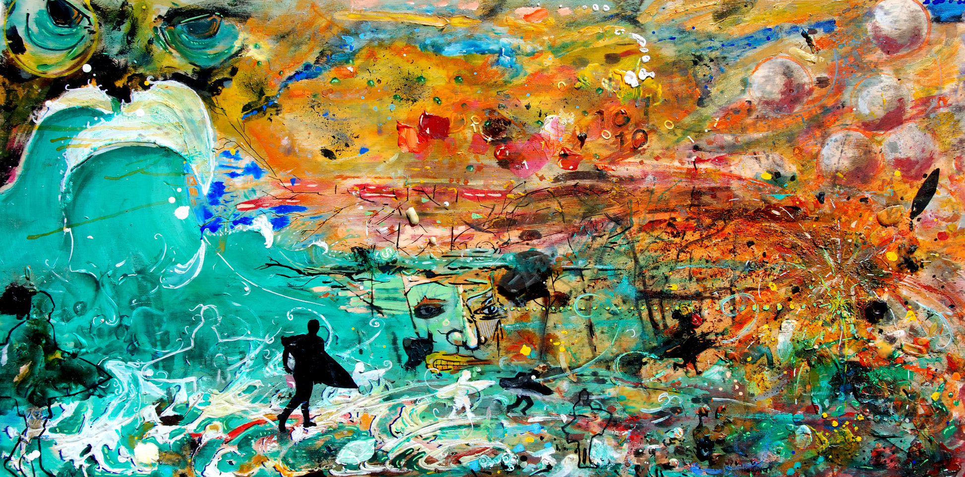 In “The Conflict Begins,” Nathan Gibbs unleashes a surreal seascape where myth and modern life collide. Towering ocean eyes loom over chaotic waves, surfers swirl beneath dripping skies, and fragmented faces surface like ancient spirits. The surfers head to battle against the techno polluters. The canvas bursts with color, motion, and narrative—evoking power, play, and cosmic reckoning. Perfect for collectors of contemporary surf art, mythological abstraction, or emotionally charged mixed-media works exploring the divine, the absurd, and the beautifully human.