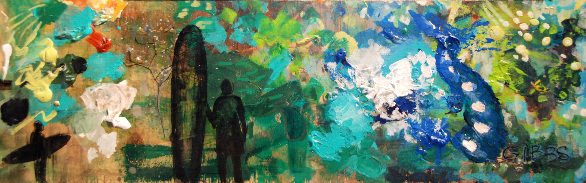 Workbench monologues is a series of abstract surreal surf art and landscape paintings that often focus on a theme. That theme could be environmental, personal growth, or any other similar topics. I will hide images within the work such as eyes, animals, or subject matter related to the overall theme. They are very organic and texture heavy. Zoom in and take a closer look at paintings within the paintings and see what there is beyond the obvious.