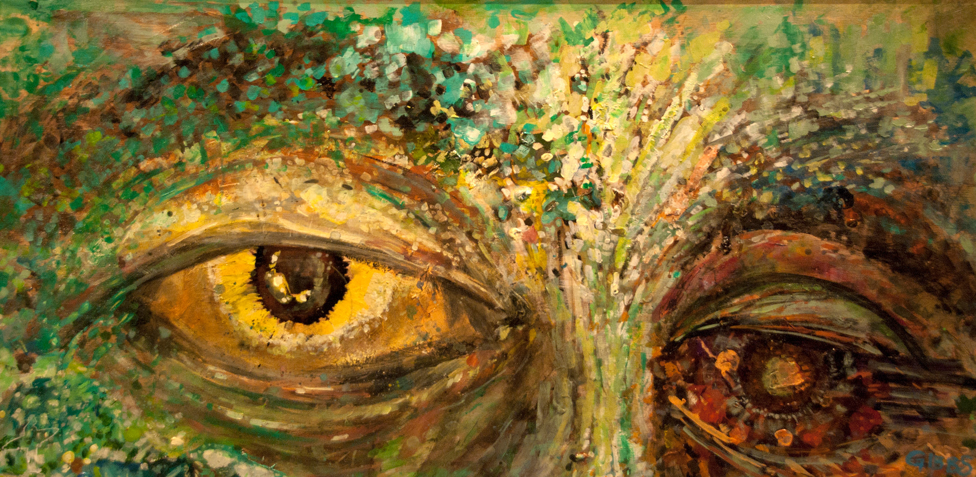 “Eye of the Beholder” by Nathan Gibbs stares straight into the soul. This vivid, hyper-expressive painting captures the primal gaze of a creature—half wild, half elemental eyes made of waves and strokes. Drenched in textured greens, ambers, and ember-like reds, it’s a visceral, hypnotic piece perfect for collectors of bold wildlife art and symbolic abstract expressionism.