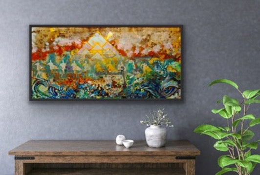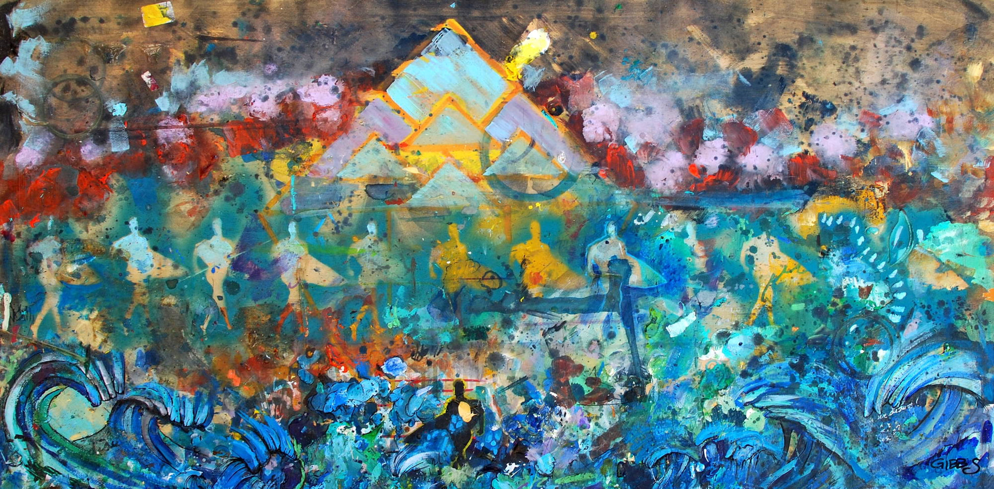 This painting by Nathan Gibbs is a visually electrifying tribute to the rhythm of the sea and the spirit of the surf. One lone surfer travels in the opposite direction from the rest inferring going against the establishment. Layers of vibrant blues, coral reds, and tropical greens crash together in a chaotic harmony, evoking the untamed beauty of ocean waves and boardriders in motion. Faint silhouettes of surfers and dance across the composition, blending into bursts of color and movement that suggest both the physical and emotional power of the water.
