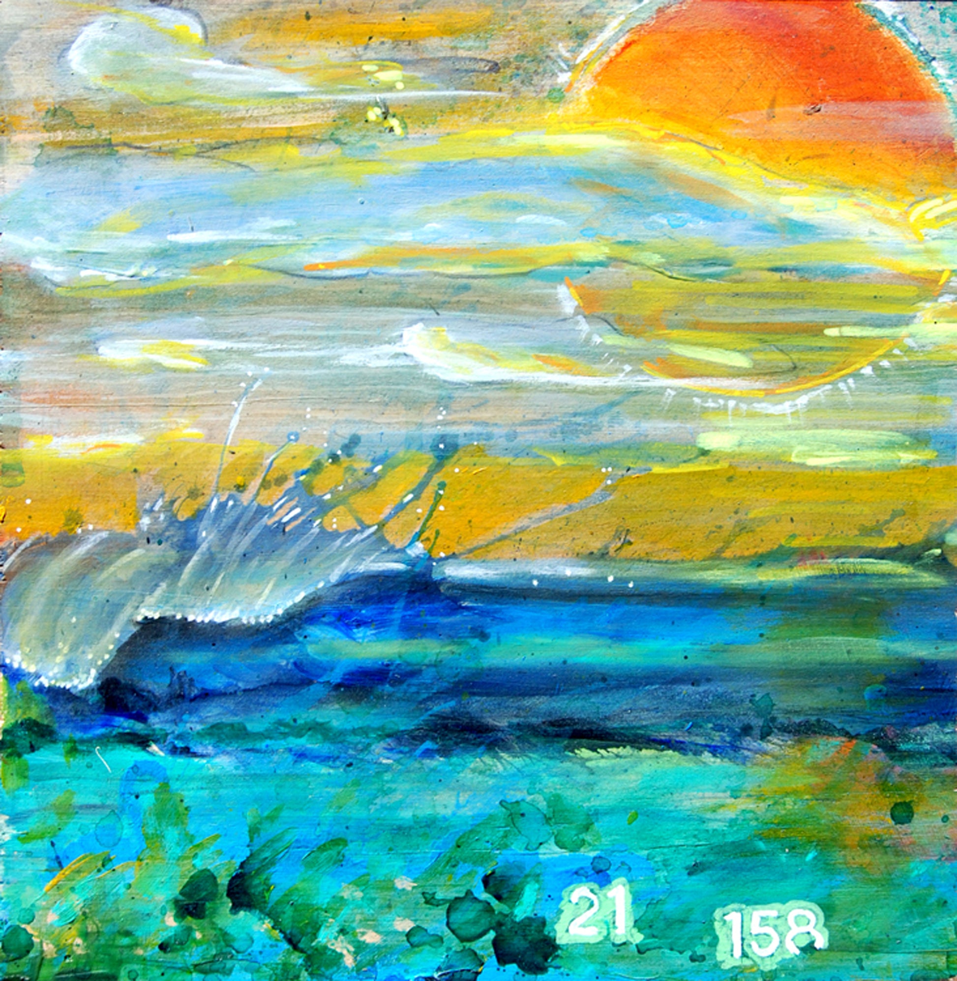 The Location Pipeline - by Nathan Gibbs captures a serene ocean sunrise through expressive color and movement. Waves shimmer in turquoise blues beneath glowing clouds and a warm sun. The cryptic numbers “21” and “158” hint at location or meaning. A luminous seascape for collectors of abstract coastal and symbolic art.