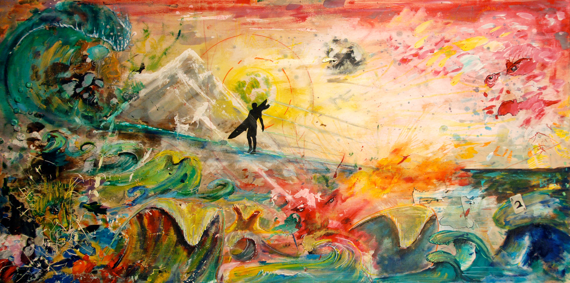 Workbench monologues is a series of abstract surreal surf art and landscape paintings that often focus on a theme. That theme could be environmental, personal growth, or any other similar topics. I will hide images within the work such as eyes, animals, or subject matter related to the overall theme. They are very organic and texture heavy. Zoom in and take a closer look at paintings within the paintings and see what there is beyond the obvious.