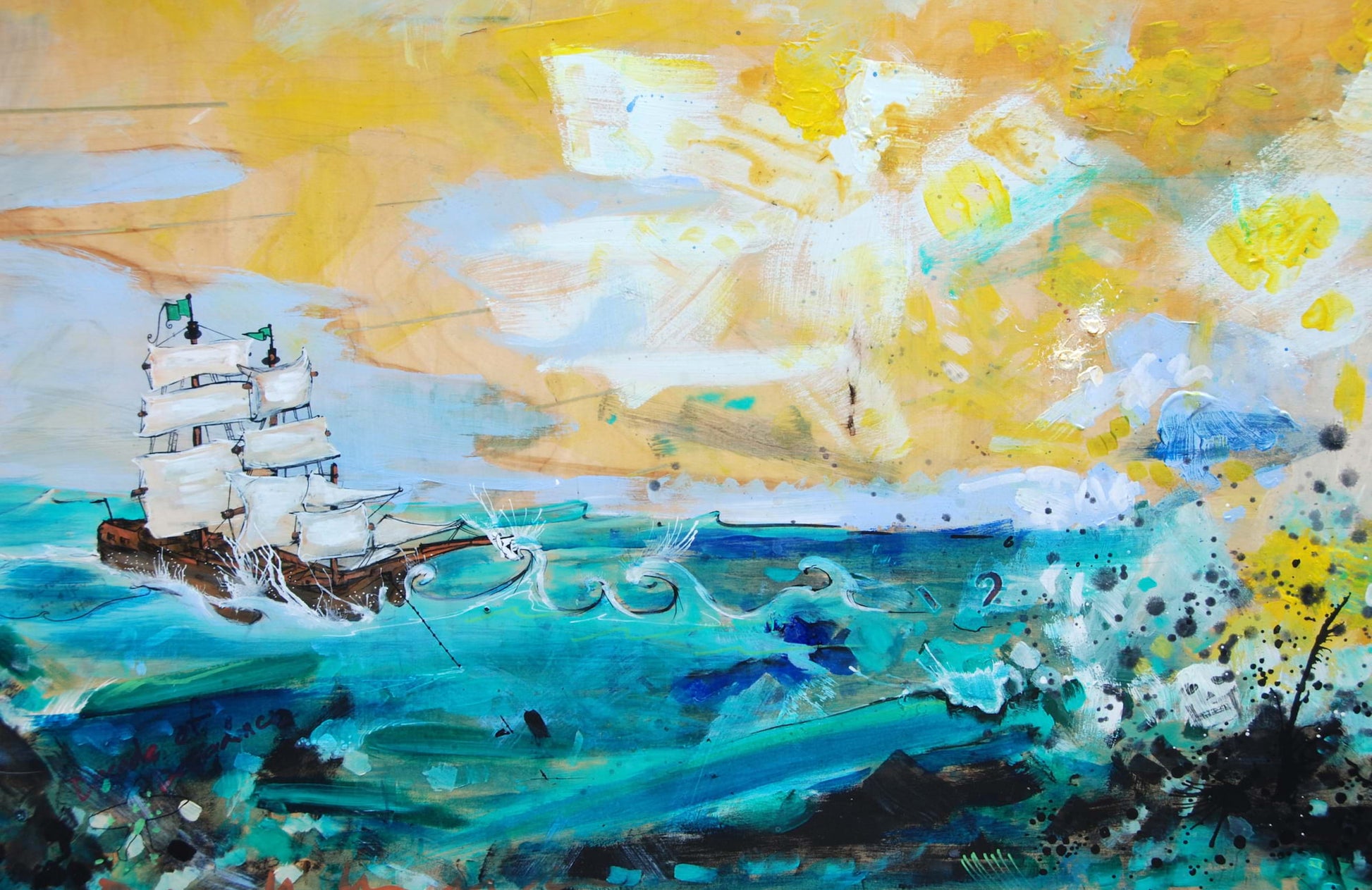 “The Point of No Return” by Nathan Gibbs spans ocean history and ecological warning in one breathtaking sweep. A tall ship meets industrial tides, oil rigs loom in the distance, and green surfboards scatter like fallen soldiers. Dynamic brushwork and radiant skies evoke both beauty and caution. A powerful coastal narrative for ocean-conscious collectors.