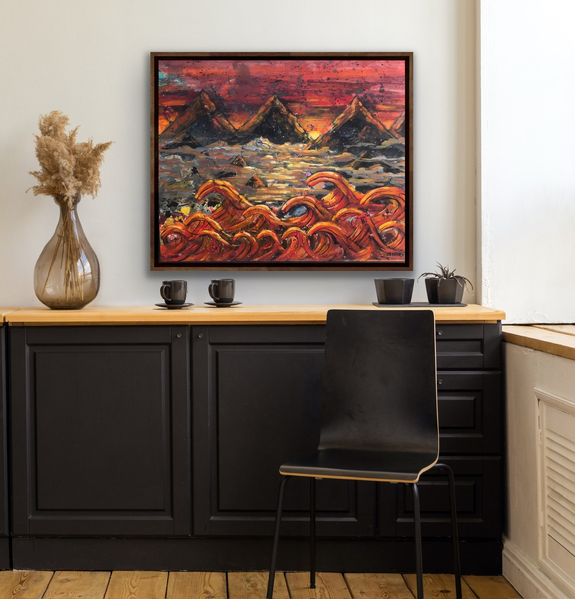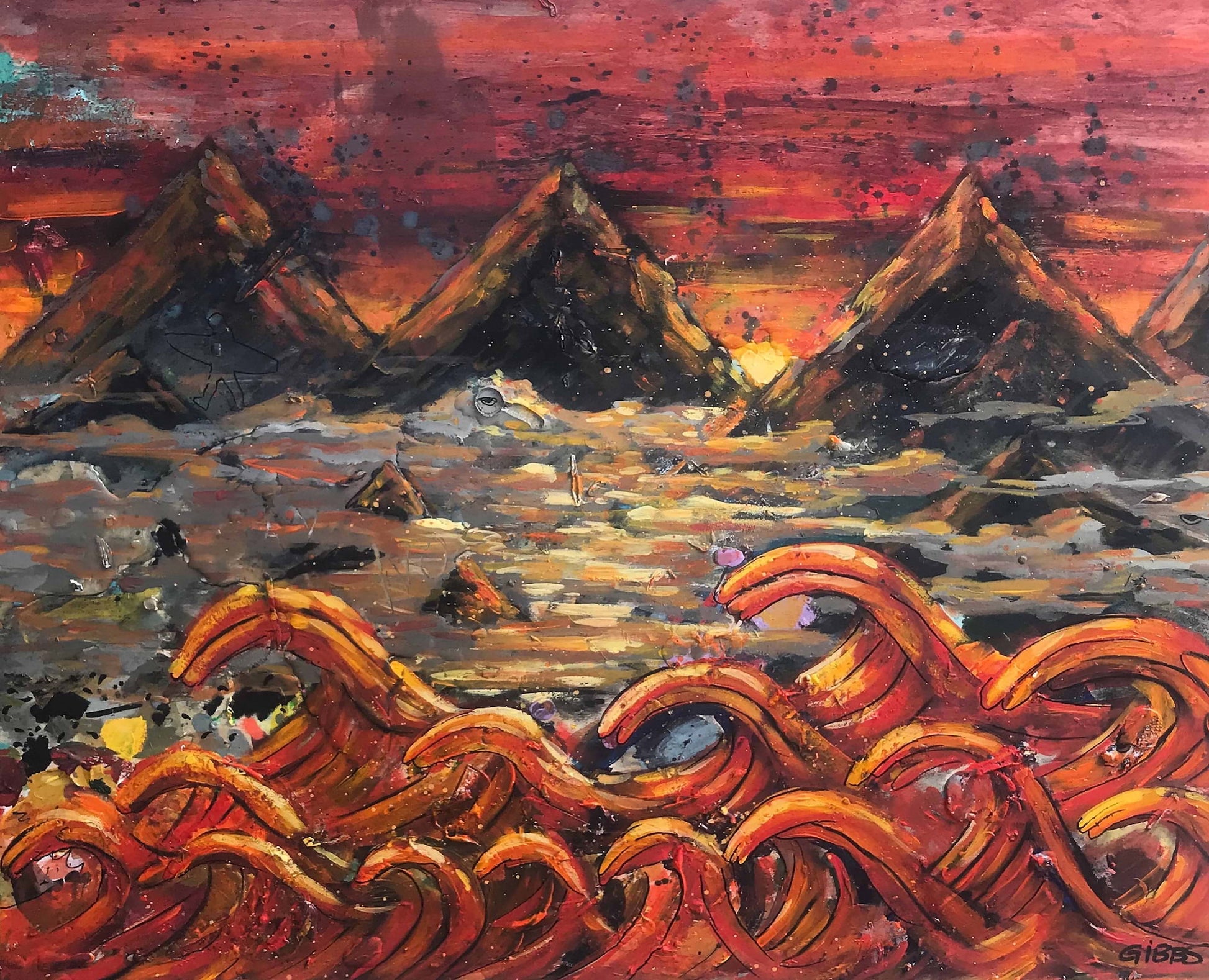 “Warming Seas” by Gibbs erupts with volcanic energy—crimson waves crash beneath a burning sky, while dark pyramids rise like sentinels over a lava-toned sea. This expressionist landscape pulses with raw motion and elemental heat. A striking work for collectors drawn to surreal coastal art with mythic, apocalyptic undertones.