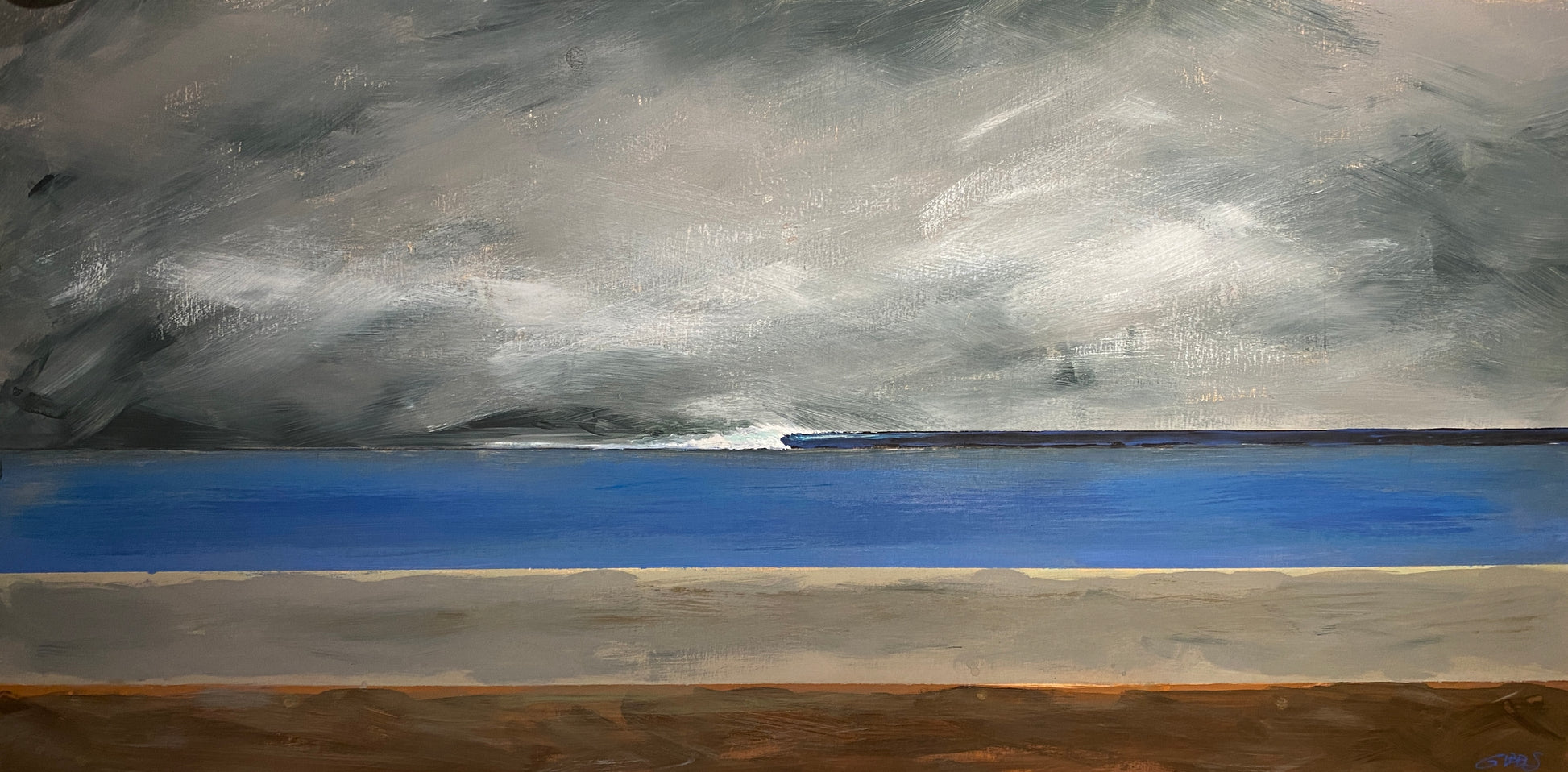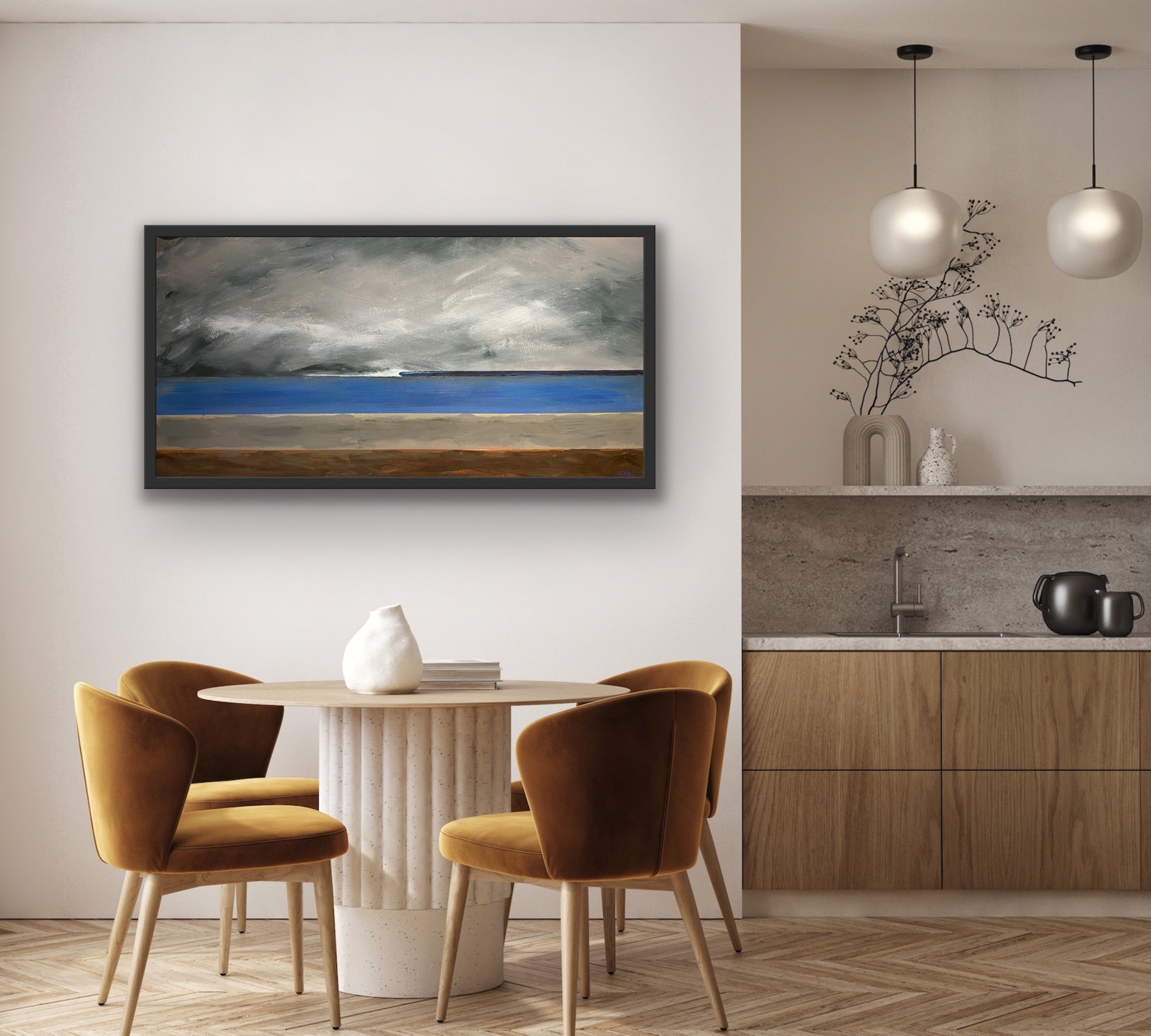 Nathan Gibbs’ “Three levels of love” captures a perfect surf horizon beneath stormy skies. With bold horizontal bands of ocean blue and sandy earth tones, this coastal artwork evokes quiet power and meditative calm. Ideal for surf art collectors, modern beach décor, and lovers of minimalist seascapes with emotional depth.