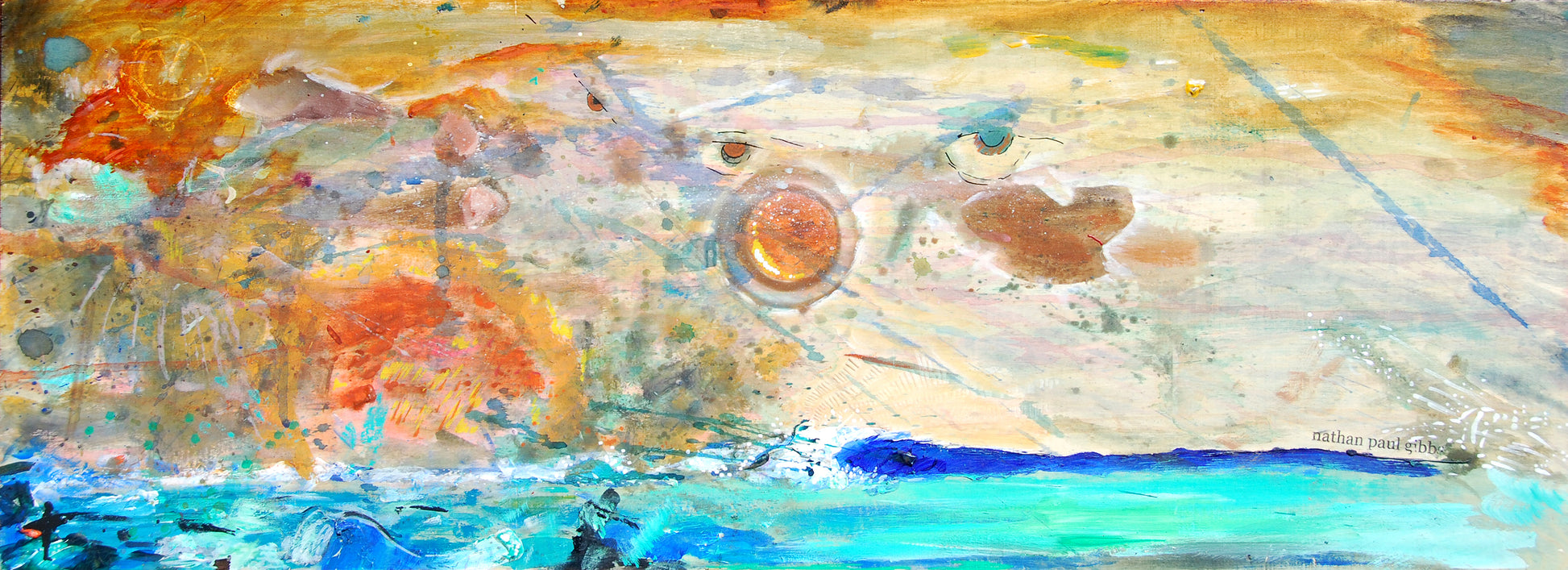 In “To Paddle,” Nathan Paul Gibbs channels ethereal energy through layered abstraction. A ghostly face emerges from a windswept sky above a tranquil turquoise sea. Earth tones and ocean blues collide in a dreamlike coastal landscape. A meditative piece for collectors of symbolic abstract seascapes and visionary contemporary art.