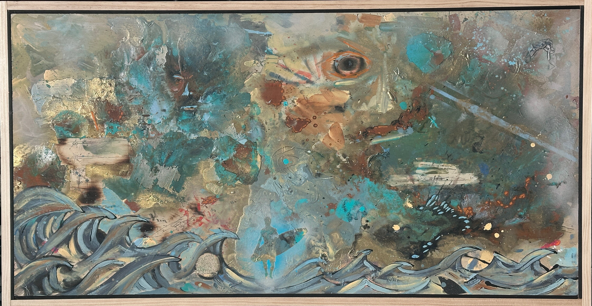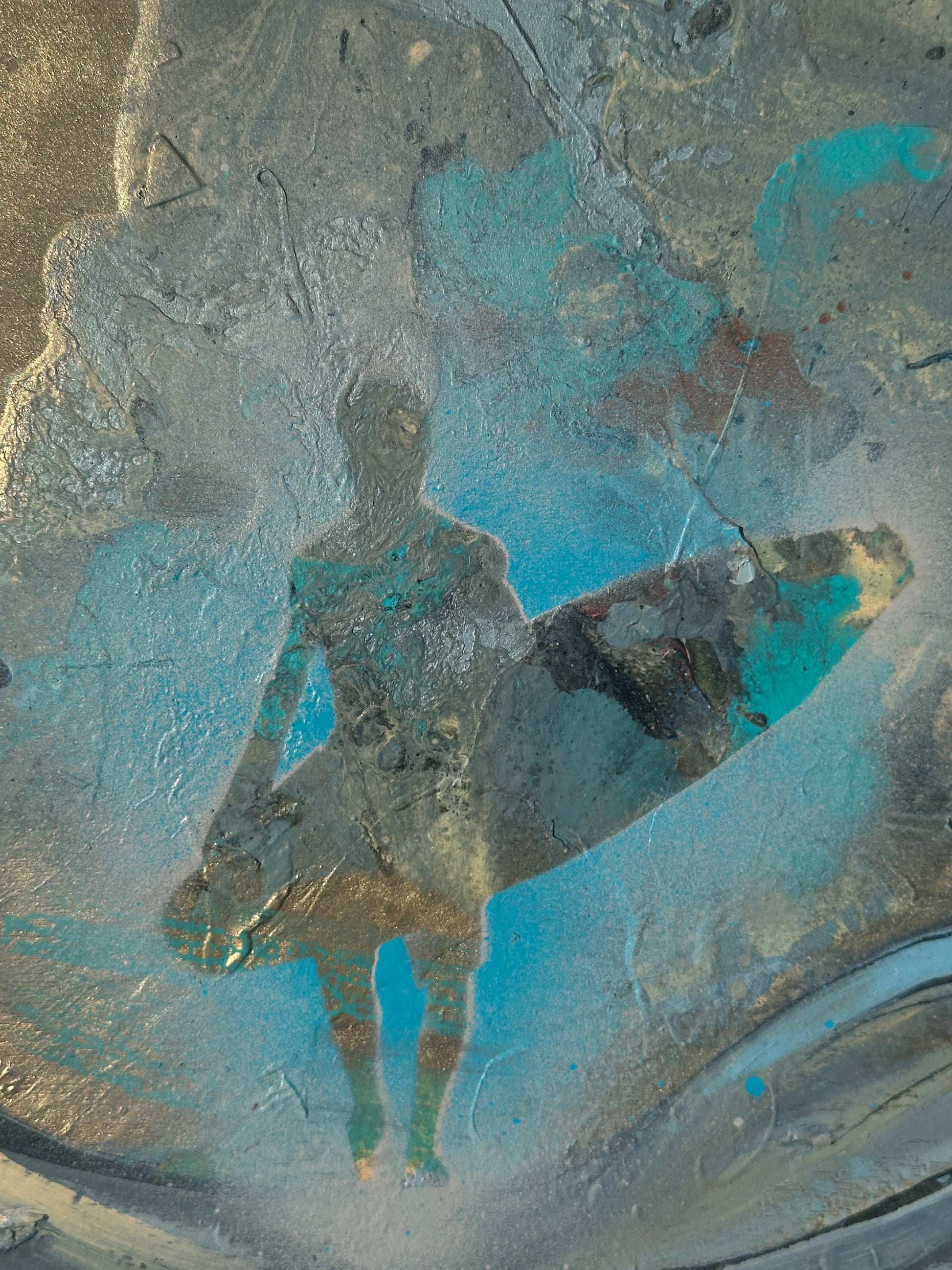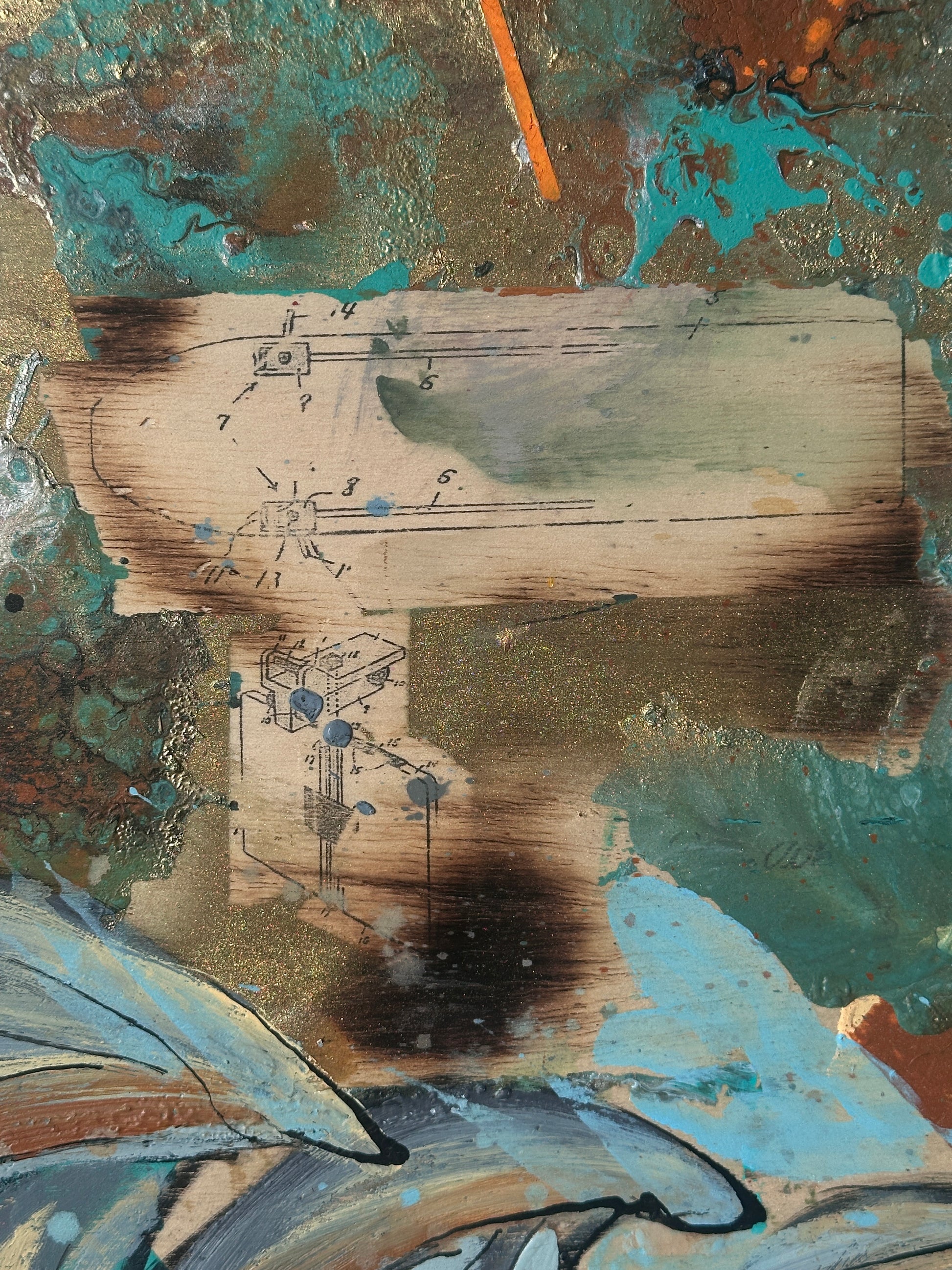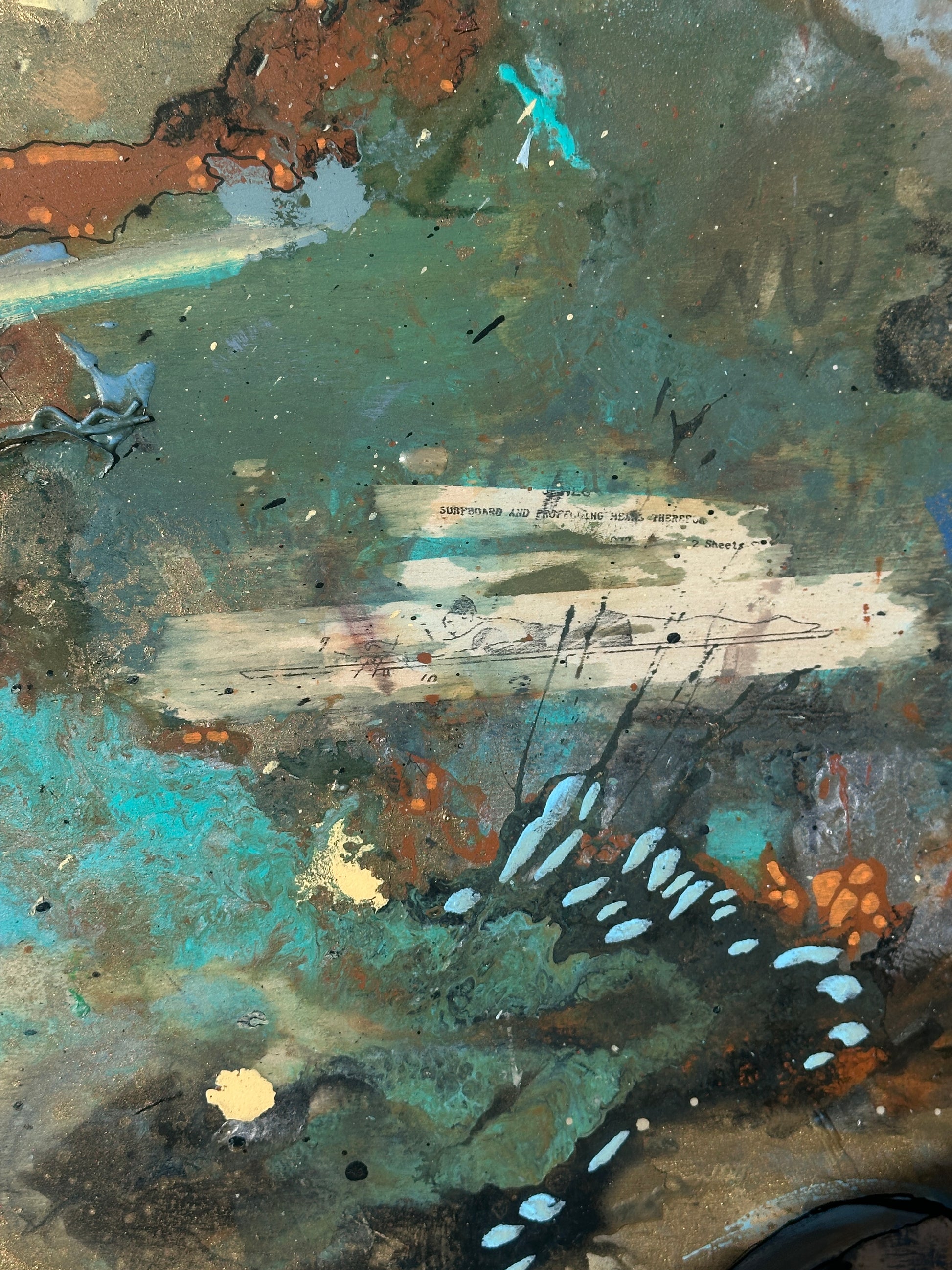 What you’re looking at is a layered coastal palimpsest—surf culture, invention, and memory pressed into one surface. The palette lives in that unmistakable Southern California zone: oxidized turquoise, salt-bleached blues, bruised sand, and flashes of warm metallic gold that catch the light like late afternoon sun hitting wet rails. It feels weathered in the best way—earned, not distressed.