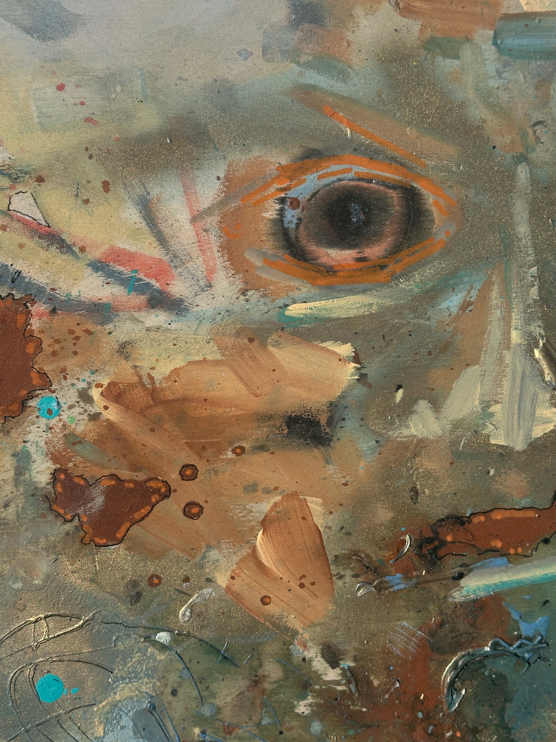 Acrylic, ink, stain, text transfers, spray paint on cradled panel