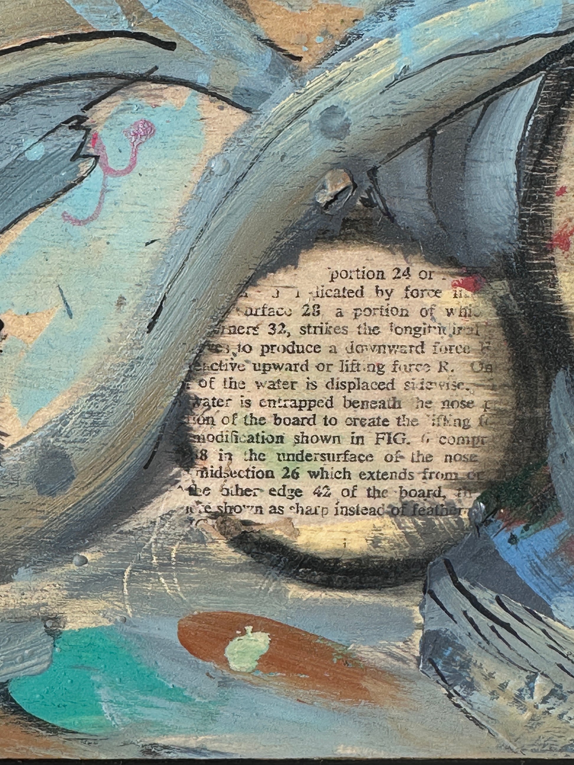 The waves along the lower edge aren’t decorative; they’re structural. They ground the composition, rolling horizontally like time itself. Embedded within them are fragments of technical diagrams and patent text—quiet nods to surf innovation, hydrodynamics, and the unseen engineering beneath something we romanticize as effortless. That contrast is very Los Angeles: beauty backed by intelligence.