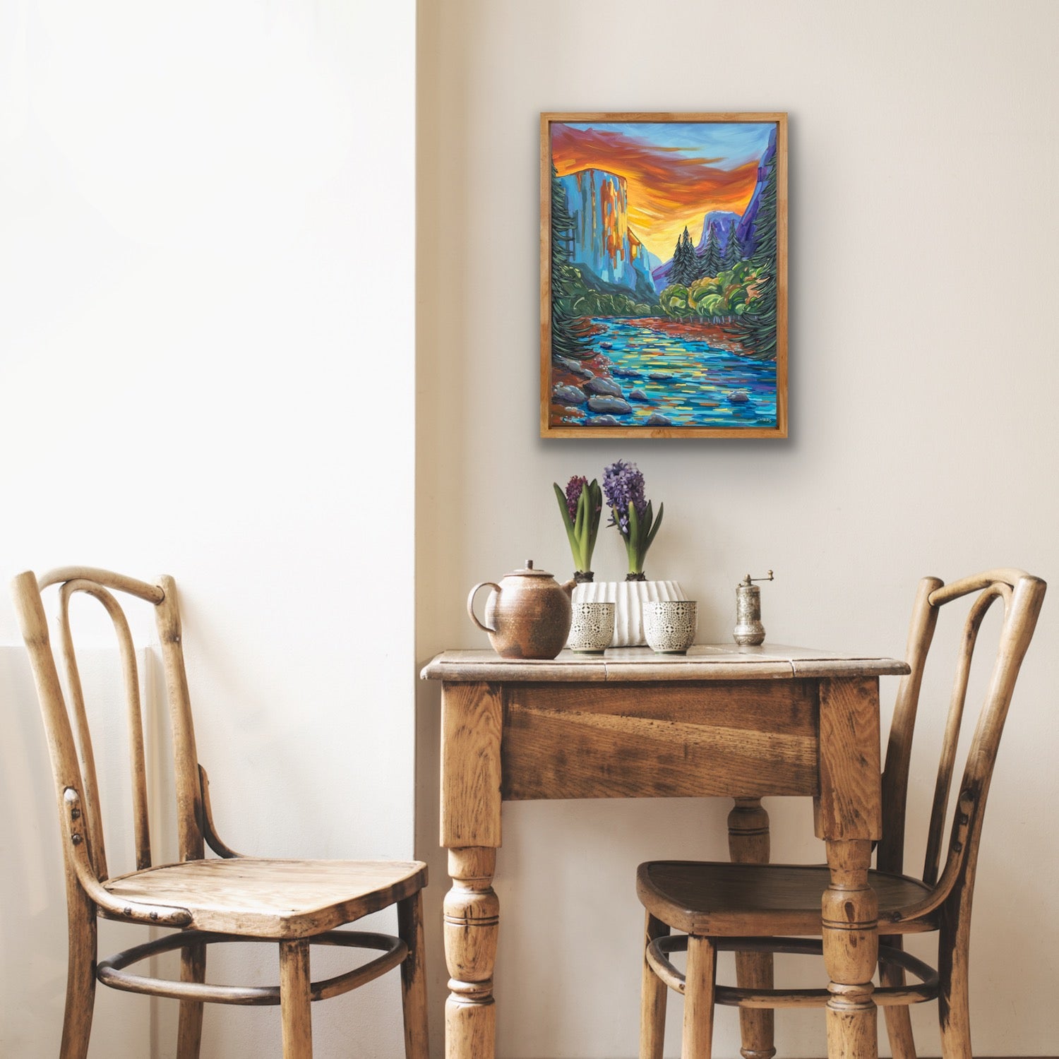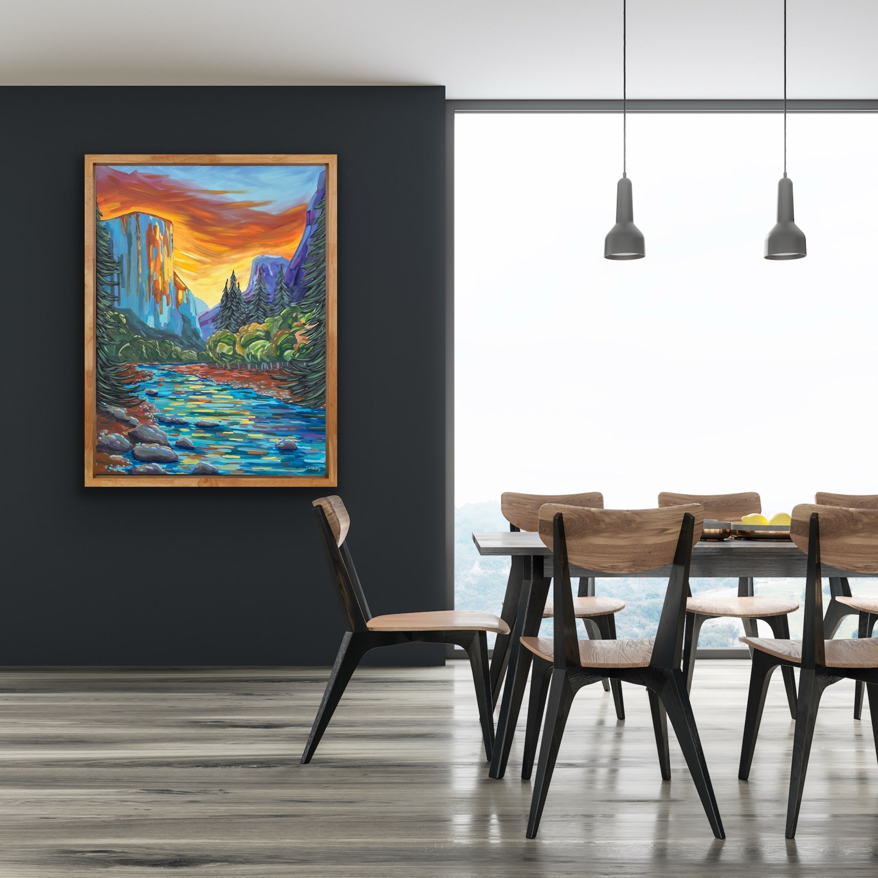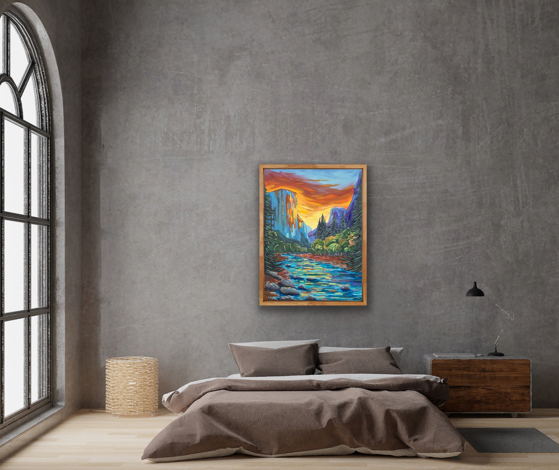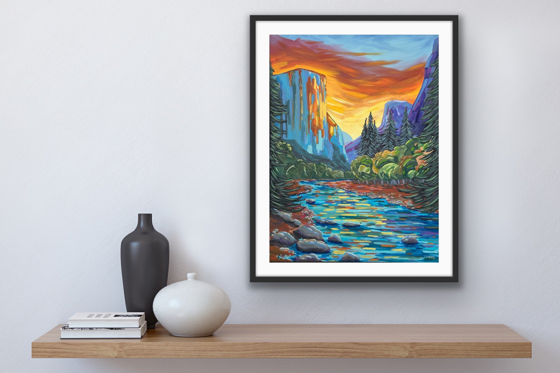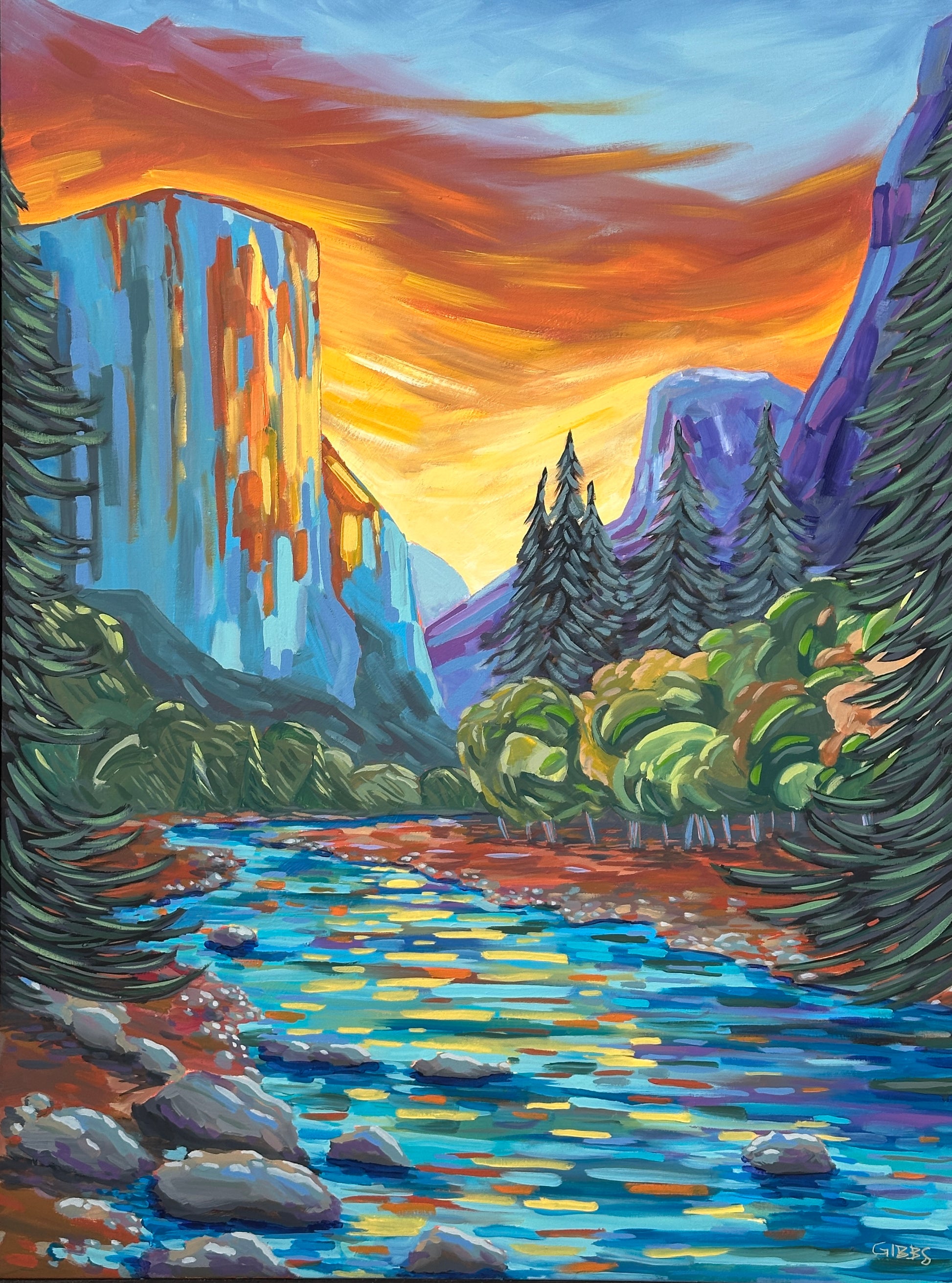 Immerse yourself in the radiant beauty of Yosemite River Sunset, a bold and expressive painting by Nathan Gibbs. This vibrant landscape captures the majesty of the Yosemite River Valley, with El Capitan rising on the left and the Merced River reflecting a fiery mountain sunset.